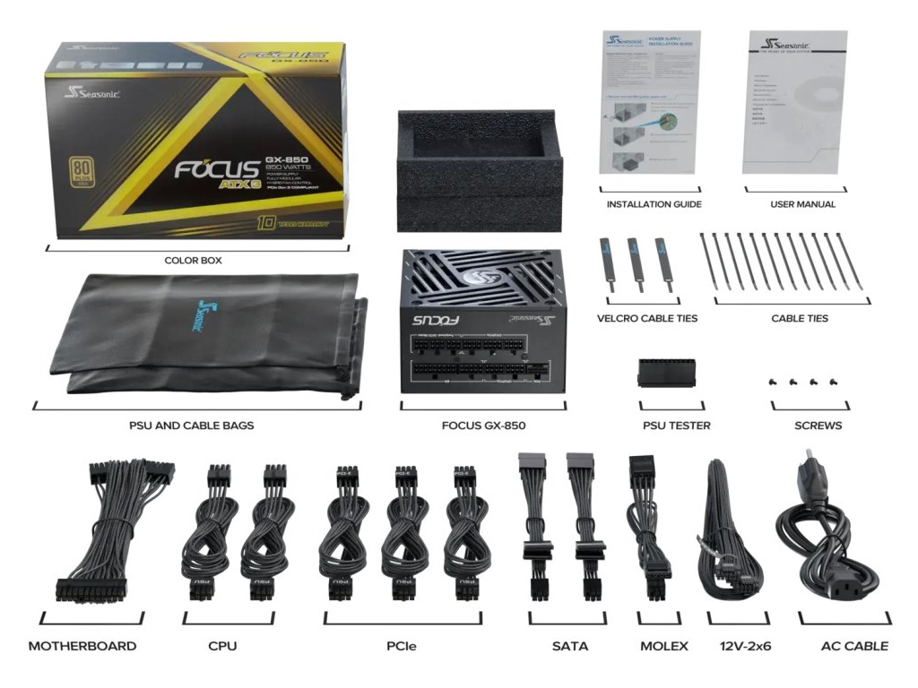 Seasonic FOCUS GX-850Napájecí zdroj o výkonu 850 W nabízí tichý chod, aktivní PFC a 135 mm velký ventilátor s FDB ložiskem. Zdroj splňuje certifikaci 80PLUS Gold a má plně odpojitelné kabely. Zdroj odpovídá specifikaci ATX 3.1 a PCIe 5.1.