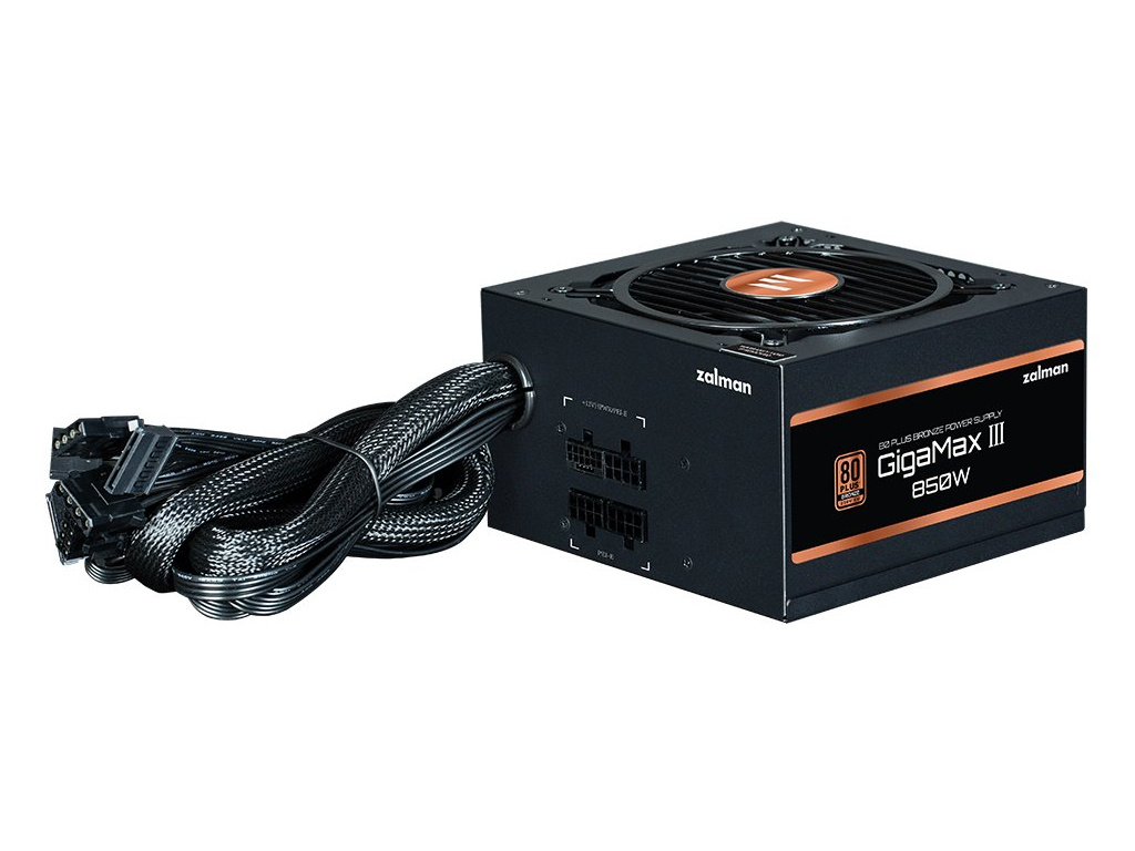 ZALMAN GigaMax III 850 WNapájecí zdroj osazen tichým 120 mm ventilátorem. Účinnost zdroje splňuje certifikaci 80PLUS Bronze.