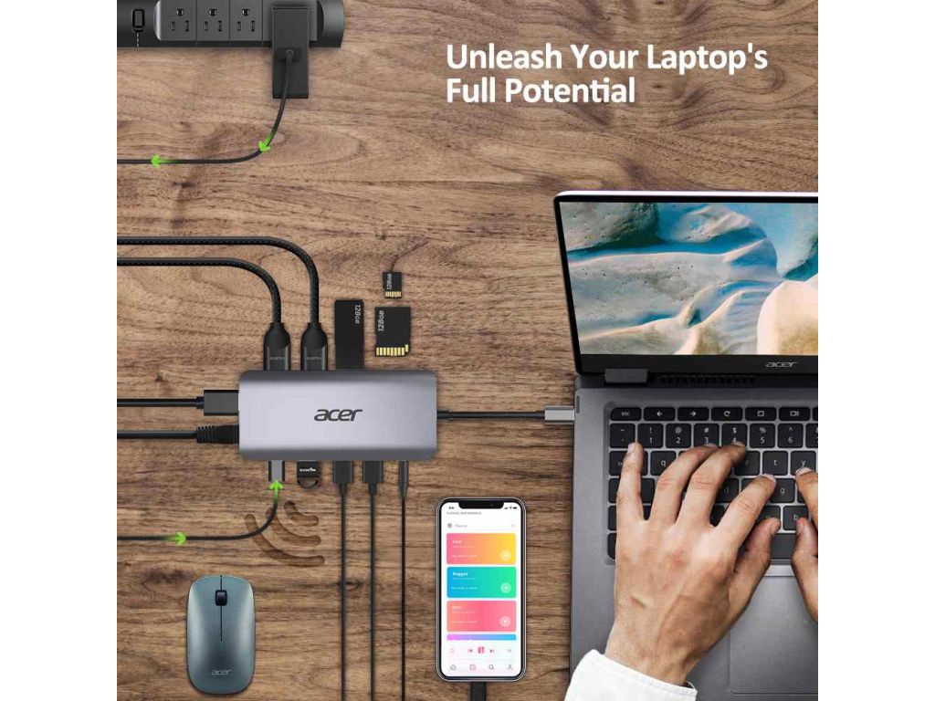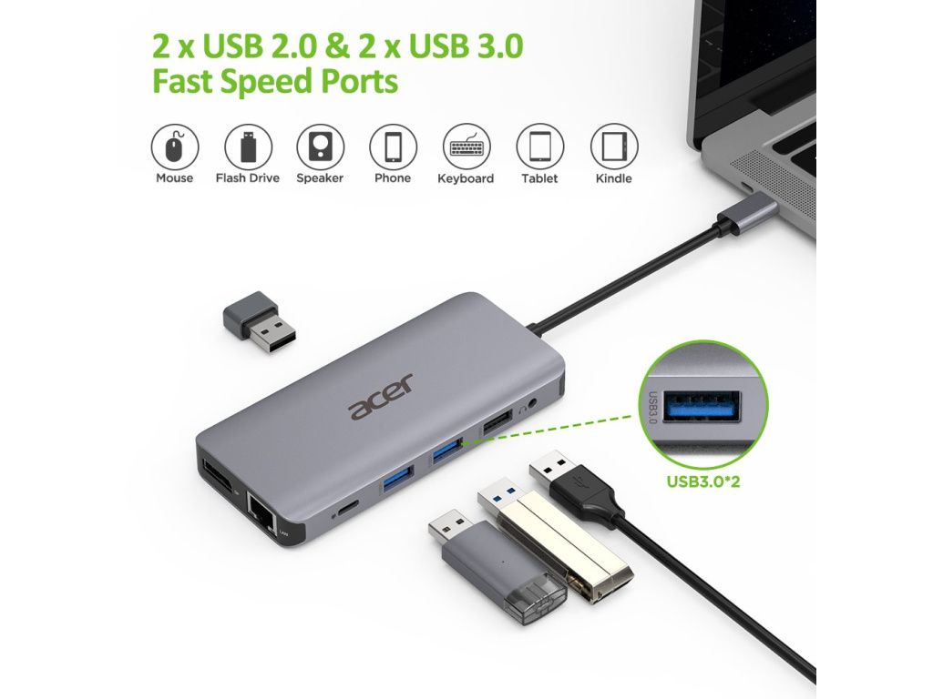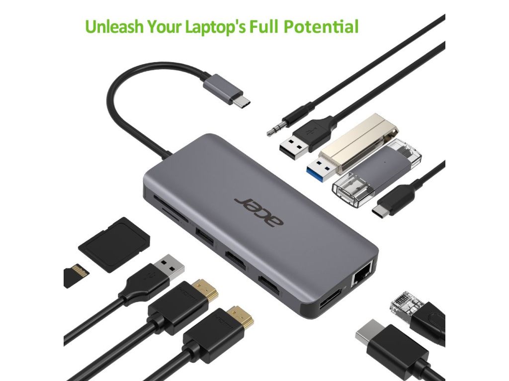 ACER 12v1 Type C dongle: 2 x USB3.2, 2 x USB2.0, 1x SD/TF, 2 x HDMI, 1 x PD, 1 x DP, 1 x RJ45, 1 x 3.5 Audio, HP.DSCAB.009