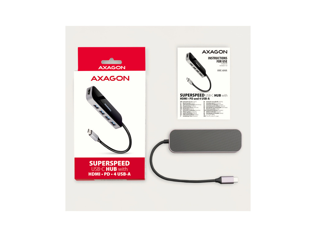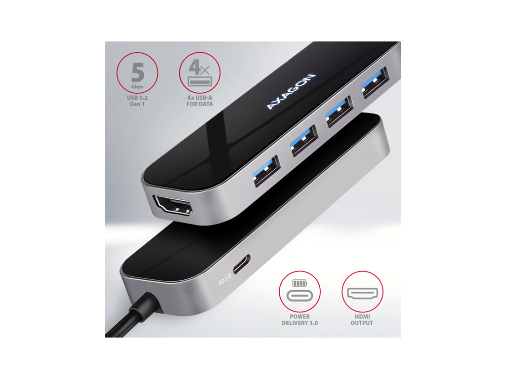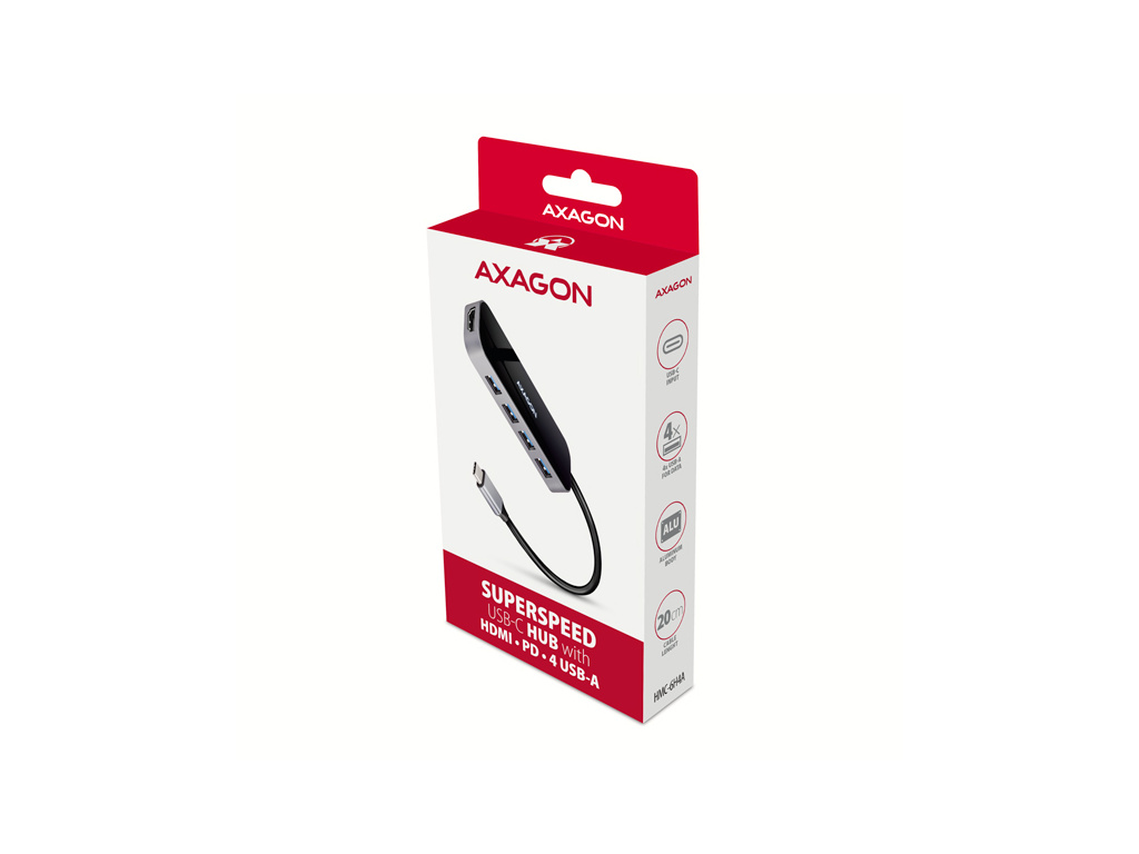 AXAGON HMC-6H4A, USB 3.2 Gen 1 hub, porty 4x USB-A, HDMI 4k/30Hz, PD 100W, kabel USB-C 20cm, HMC-6H4A