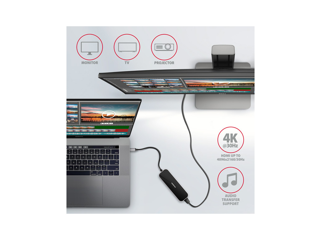 HDMI výstup poskytuje kvalitní obraz až do rozlišení 4K/30Hz Ultra HD a podporuje přenos vícekanálového zvuku. Podporována jsou také oblíbená hráčská rozlišení WQHD 2560 x 1440 při 60Hz nebo FullHD 1920 x 1080 při 60, 100 a 120Hz max. Pro správné fungování video výstupu je nutné, aby USB-C port notebooku podporoval DisplayPort Alternate Mode (DP Alt Mode) nebo Thunderbolt 3.