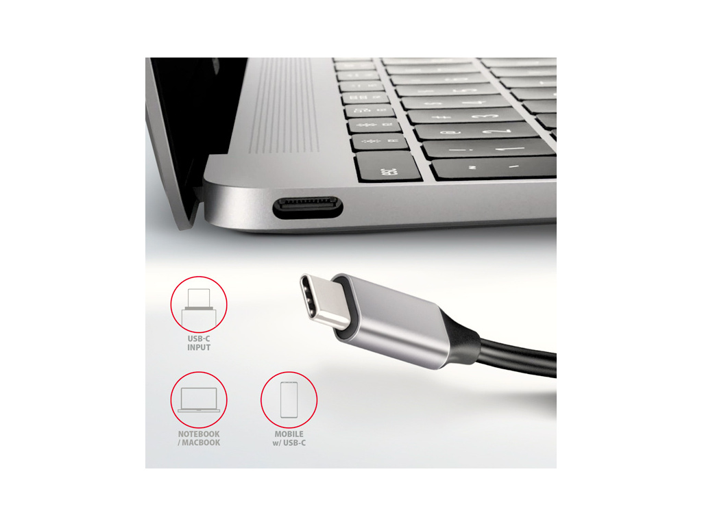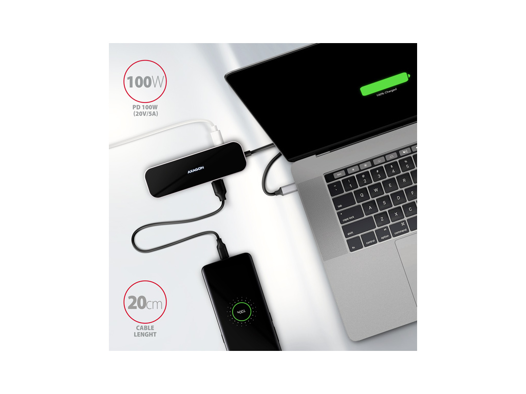 USB-C konektor je vyhrazen pouze pro napájení a současné dobíjení telefonů nebo notebooků pomocí technologie Power Delivery 3.0 výkonem až 100W. Do hubu zapojíte USB-C Power Delivery nabíječku a hub připojíte k notebooku. Tím také uvolníte jeden USB-C port. Podmínkou je notebook s podporou nabíjení z USB-C portu pomocí Power Delivery a vhodná PD nabíječka.