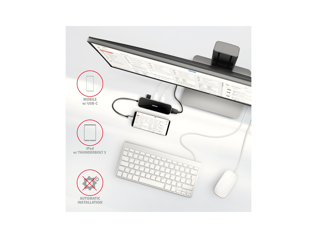 Replikátor portů je ideálním doplňkem pro notebooky bez USB-A konektorů a video výstupu. V hubu lze využít Vaše stávající USB periferie bez nutnosti pořizování nových. Díky funkcím Plug and Play a Hot Plug je samotné zapojení hubu velmi jednoduché bez složité instalace a také lze jednoduše připojovat a odpojovat periferie za běhu počítače. Rozbočovač se nezalekne ani připojení k telefonům s USB-C konektorem. K telefonu tak připojíte například flash disk, klávesnici, myš, monitor, TV nebo projektor.