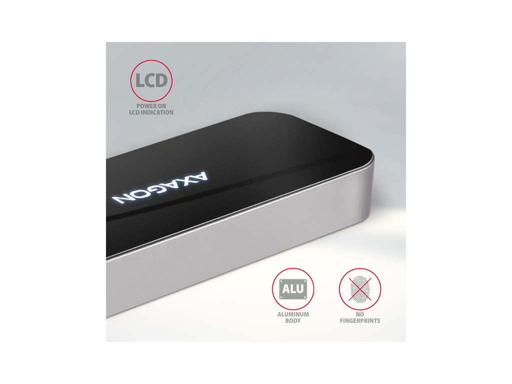 Elegantní hliníkové tělo zajistí nejen mechanickou odolnost, ale i kvalitní chlazení. Horní lesklá část s decentně podsvíceným logem podtrhuje prémiový vzhled hubu.