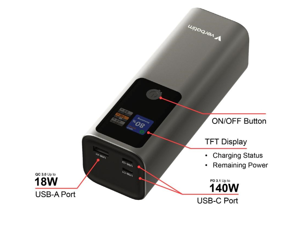 VERBATIM Powerbanka Charge 'n' Go, 27000 mAh, 2x USB-C 140W, 1x USB-A 18W, Šedá, 32269