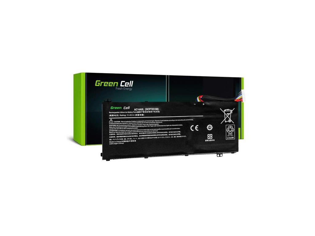 Description: Capacity: 3800 mAh Voltage: 11,4 V Number of cells: 3 Cells technology: Li-Polymer Warranty: 12 months Cells manufacturer: Green Cell Overheat protection: Yes Surge protection: Yes Colour: Black Overdischarge protection: Yes Overcharge protection: Yes Product code: AC54 Manufacturer: Green Cell Compatibility list: Compatible with following battery models : AC14A8L,AC15B7L Compatible with following devices : Acer Aspire V15,Acer Aspire V17,Acer Aspire VX,Acer Aspire VX 15 VX5-591,Acer Aspire VX 15 VX5-591G,Acer Aspire V15 Nitro VN7-571G,Acer Aspire V15 Nitro VN7-572G,Acer Aspire V15 Nitro VN7-591G,Acer Aspire V15 Nitro VN7-592G,Acer Aspire V17 Nitro VN7-791G,Acer Aspire V17 Nitro VN7-792G,Acer Spin 3,Acer Spin 3 SP314-51EAN: 5902719428449