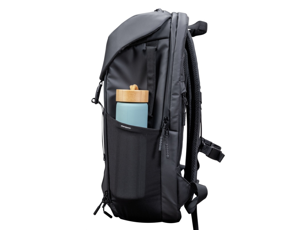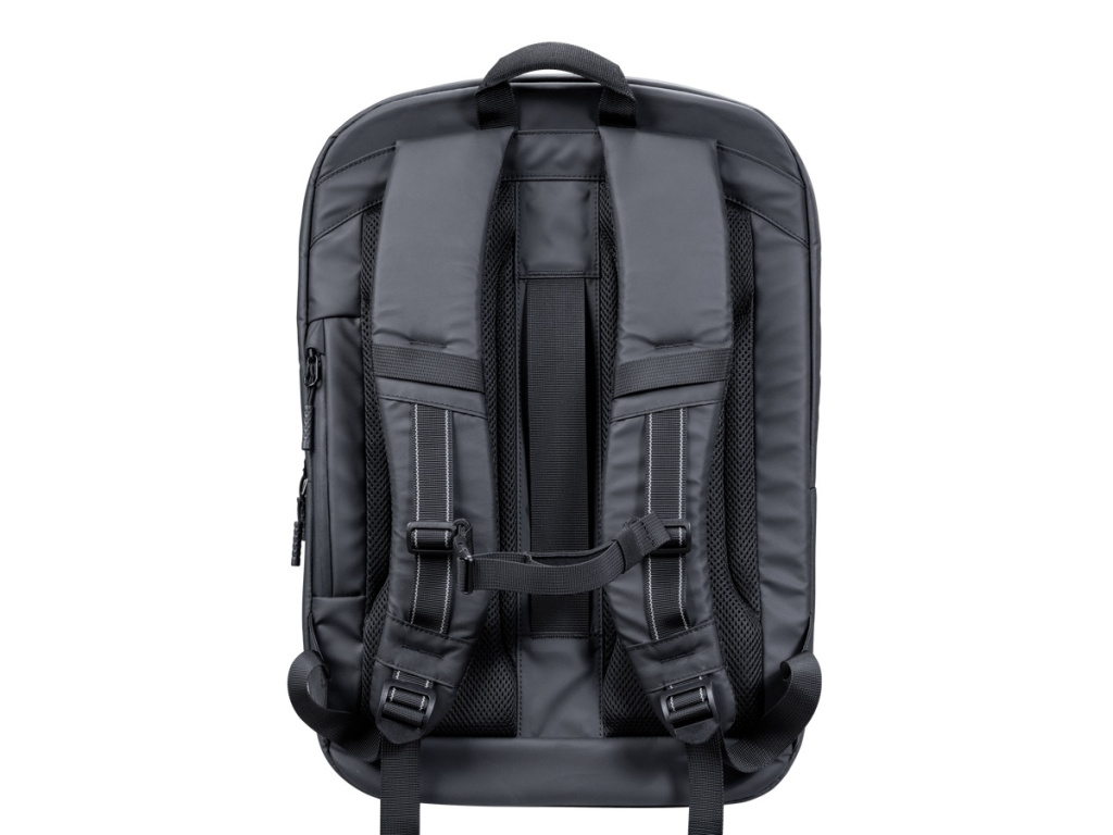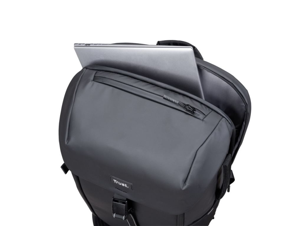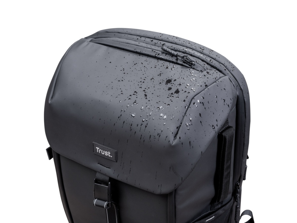 Trust Jersey cestovní batoh prostorný, voděodolný batoh pro celodenní použití, kompatibilní s notebooky do velikosti 17'' Vylepšete své každodenní dojíždění prostorným, ale kompaktním 25litrovým cestovním batohem Jersey. Je vyrobený z 19 recyklovaných PET lahví a představuje udržitelný způsob, jak převážet vše, co potřebujete, takže je ideální pro práci, studium nebo objevování města. Už nikdy se nemusíte bát deště. Díky voděodolným materiálům potaženým PU IPX4, zipům a hornímu krytu zůstanou vaše nezbytnosti v suchu. Nárazuvzdorná přihrádka chrání notebooky do velikosti 17'', zatímco vestavěná kapsa AirTag vám umožní mít batoh neustále pod kontrolou. Polstrované ramenní popruhy, hrudní popruh a praktická boční rukojeť zajišťují, že vám tento batoh perfektně padne. Míříte na letiště? Stačí ho nasadit na kufr pomocí popruhu upevnit a cestovat bez stresu.