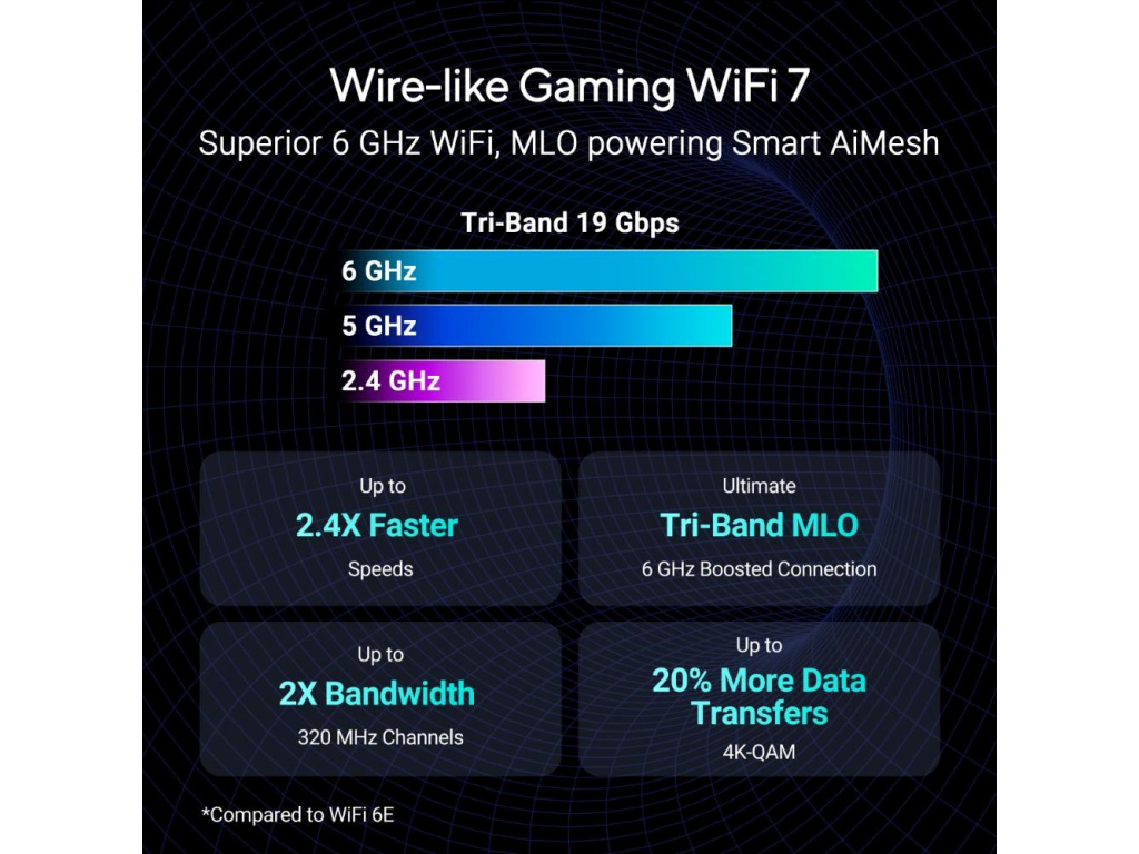 WiFi 7 (IEEE 802.11be) obsahuje všechny výhody WiFi 6/6E a rozšiřuje několik stávajících standardů WiFi na zcela novou úroveň, například šířku pásma 320 MHz a 4K-QAM. Zavádí také některé revoluční funkce, jako je například provoz s více linkami. Tyto kombinované technologie poskytují nadstandardně vysoké rychlosti, extrémně nízkou latenci a zvýšenou spolehlivost. Můžete si tak vychutnat bezkonkurenční síťové zážitky na jakémkoli online bojišti.