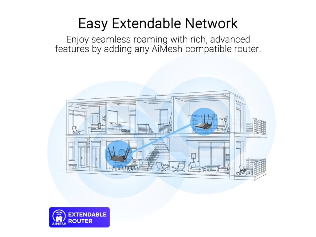 - Snadno rozšiřitelná síť - Vychutnejte si bezproblémový roaming s bohatými pokročilými funkcemi přidáním libovolného routeru kompatibilního s AiMesh.