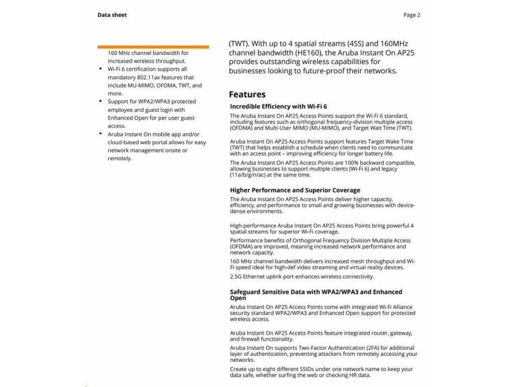 Ultra-high-speed performance for high-density small businesses. Perfect for gaming, boutique hotels, tech start-ups and professional offices. The rise of the remote and hybrid workplace has placed increased pressure on business networks. Existing Wi-Fi infrastructure is struggling to support the explosion of devices and bandwidthhungry applications - all contributing to spotty video calls and sluggish download speeds. The Aruba Instant On AP25, a 4x4 Wi-Fi 6 access point, is designed to meet the increasing volume of connected devices. Delivering superior performance, coverage, and speed at a competitive price, the AP25 is the perfect access point for small and growing businesses. The Wi-Fi Certified 6TM AP25 delivers faster Wi-Fi speeds, greater capacity, and reduced latency between access points and devices for a superior Wi-Fi experience. AP25 improves efficiency and reduces congestion for networks with many connected devices, making it ideal for high-density environments. And with 4x the capacity of 802.11ac access points, the AP25 provides exceptional user experience, allowing businesses to serve more customers with higher speed and less congestion. Features of the AP25 include orthogonal frequency-division multiple access (OFDMA), multi-user MIMO and target wake time (TWT). With up to 4 spatial streams (4SS) and 160MHz channel bandwidth (HE160), the AP25 provides groundbreaking wireless capabilities for businesses looking to boost performance and future-proof their networks. |