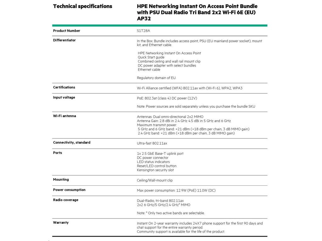 HPE Networking Instant On Access Point Bundle with PSU Dual Radio Tri Band 2x2 Wi-Fi 6E (EU) AP32 ( S1T28A ), S1T28A