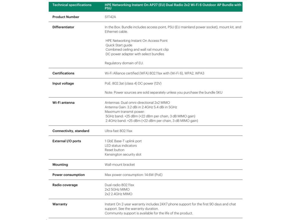 HPE Networking Instant On AP27 (EU) Dual Radio 2x2 Wi-Fi 6 Outdoor AP Bundle with PS (Includes 30W PoE midspan injector, S1T42A