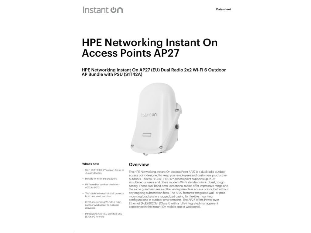 HPE Networking Instant On Access Point AP27 je dvoupásmový venkovní přístupový bod navržený tak, aby udržel vaše zaměstnance a zákazníky produktivní i venku. Tento přístupový bod s certifikací Wi-Fi CERTIFIED 6™ podporuje až 75 současně připojených uživatelů a nabízí moderní standardy Wi-Fi v robustním a odolném provedení. Tyto dvoupásmové všesměrové antény poskytují působivý dosah a stejné funkce jako jiné podnikové přístupové body, ale bez jakýchkoli průběžných poplatků za předplatné. AP27 je vybaven integrovanými držáky pro montáž na zeď nebo stožár v odolném krytu pro flexibilní instalace ve venkovních prostředích. AP27 nabízí napájení přes Ethernet (PoE) 802.3af (třída 4) s plně integrovanou správou prostřednictvím mobilní aplikace Instant On nebo webového portálu.