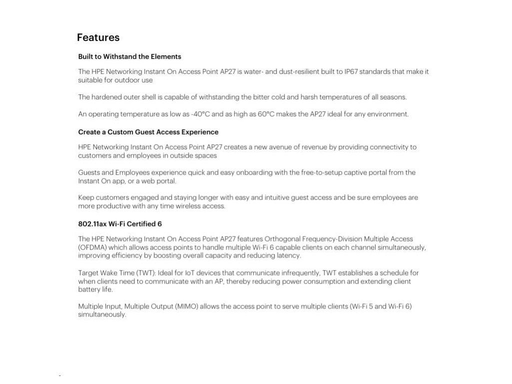 Take your business outdoors with the HPE Networking Instant On Access Points AP27. This fast outdoor Wi-Fi 6 AP is IP67 rated, keeping you connected through hot summers, frigid winters, rain, sleet, and snow. Able to withstand temperatures from temperatures from -40°F to 149°F, you can confidently connect up to 75 devices over Wi-Fi 6 to extend coverage to parking lots, outdoor workspaces, and hotel pools.