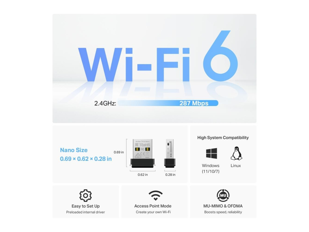 | Package Content | 1× AX300 Nano Wi-Fi 6 Wireless USB Adapter Archer TX1U Nano