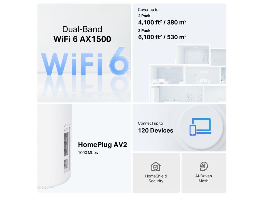 TP-Link Mesh Technology Optional Ethernet backhaul work together to link Deco units to provide seamless coverage Powerline Technology Uses your home's electrical wiring to create stronger connections between Deco units, reducing the impact of walls or other obstacles on signal 2 × dual-band antennas Multiple antennas form a signal-boosting array to cover more directions and large areas |