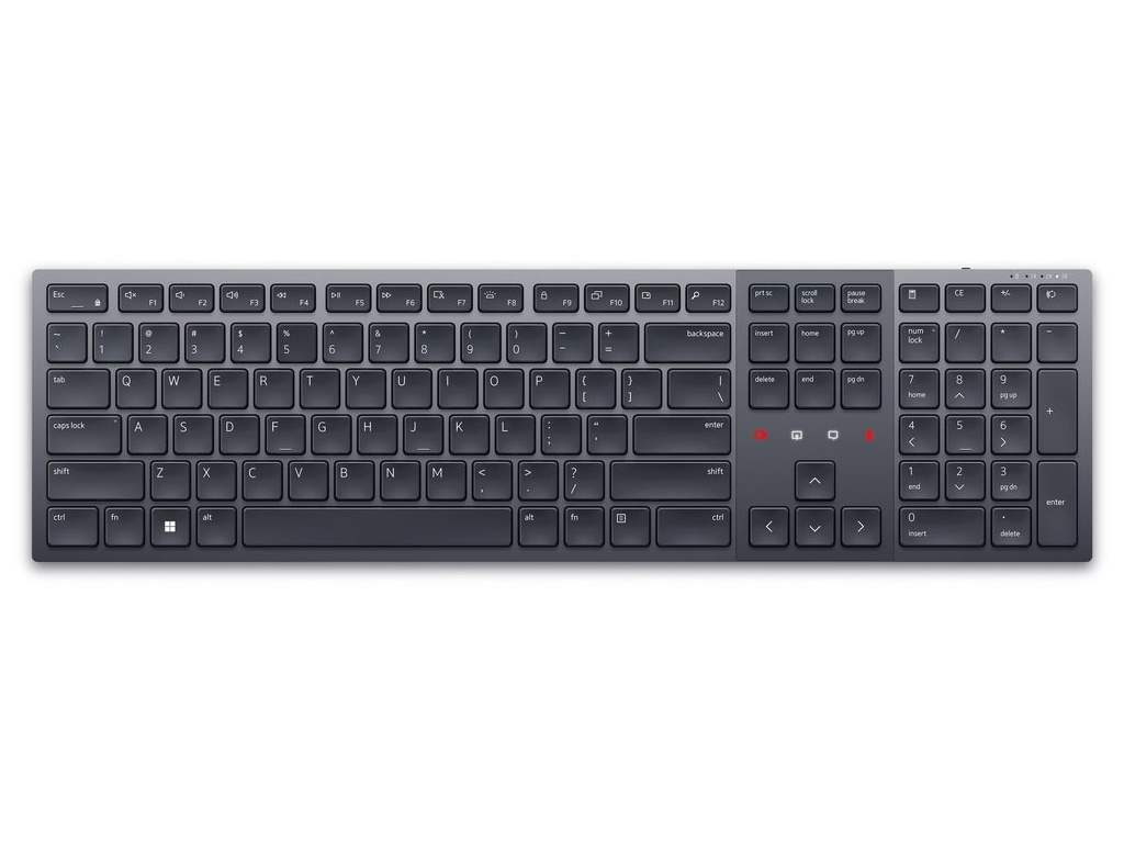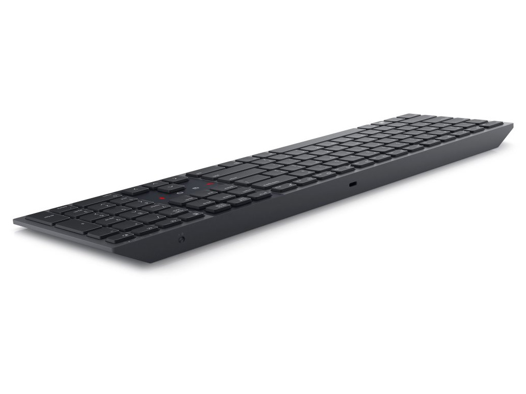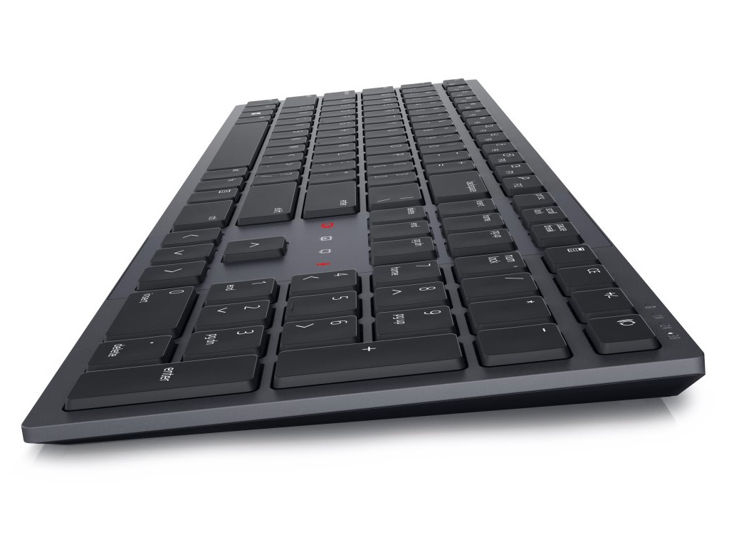 Stylová plnohodnotná bezdrátová klávesnice Dell podporuje připojení až ke třem zařízením v jeden moment. Napájení zajišťuje integrovaná baterie, která se dobíjí pomocí přiloženého USB-C kabelu a zaručí výdrž až 20 dnů. Připojení je realizováno bezdrátově skrze Bluetooth či miniaturní USB přijímač a technologii 2,4 GHz.