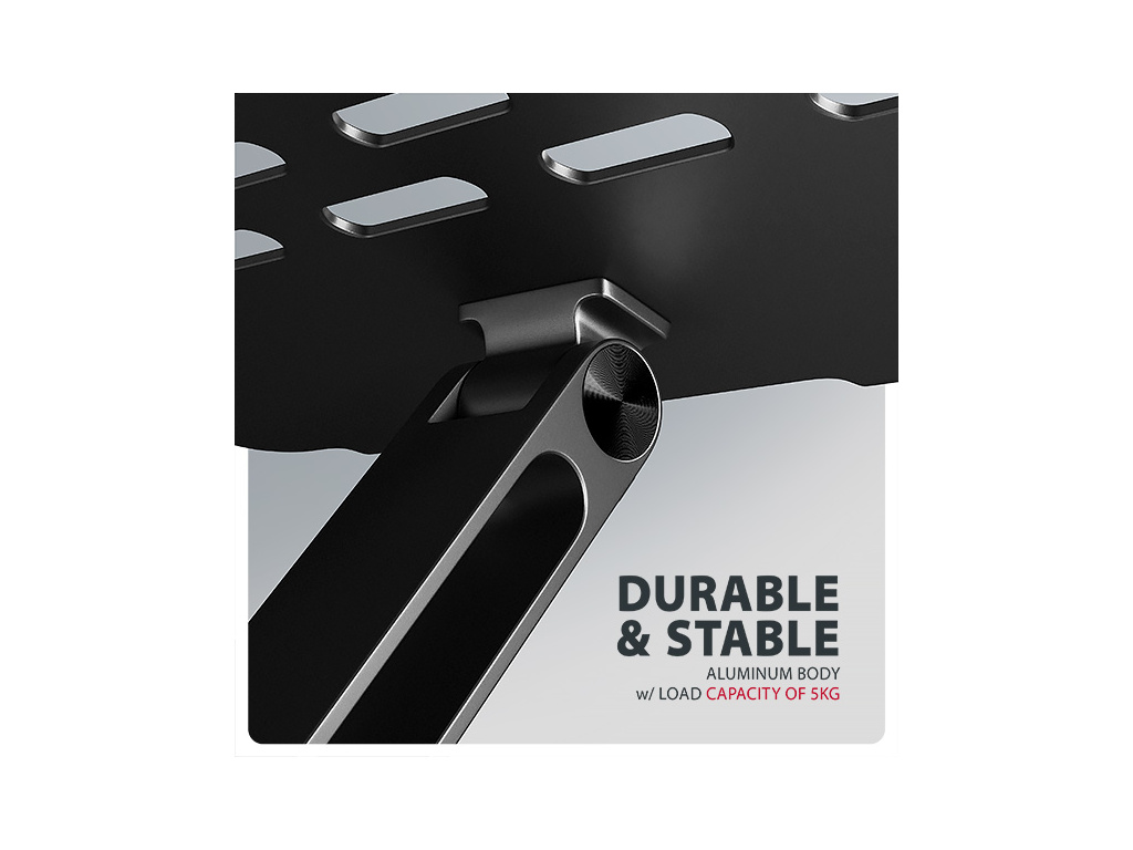 robustních hliníkových odlitků garantujících dlouhou životnost a spolehlivost. Díky protiskluzové úpravě se nemusíte obávat nežádoucích pohybů – vaše zařízení zůstane pevně na svém místě, a to bez poškození povrchu notebooku či podložky. Tyto pečlivě navržené vlastnosti zaručují perfektní stabilitu pro váš