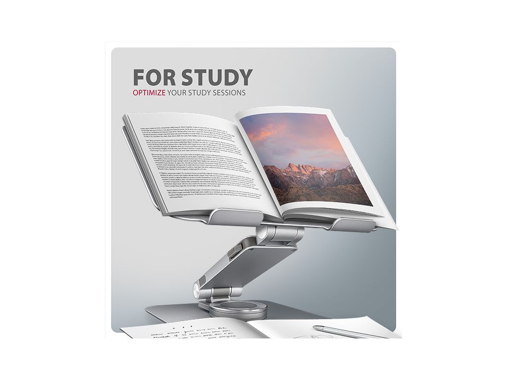ideální výšku a úhel pro uvolnění krčních a zádových svalů. Díky 360° mechanismu a výsuvnému ramenu se dokonale přizpůsobí vašim potřebám ať už pracujete doma, v kanceláři, nebo na cestách. Kompaktní a přenosný design stojanu vám zajistí komfortní pracovní prostředí kdekoliv.