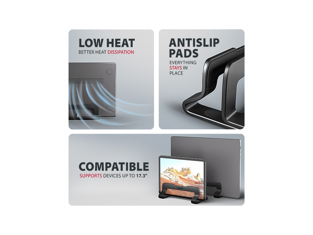 elegantní design v černé barvě nejen stylově doplní váš pracovní stůl, ale také přináší praktické funkce, které oceníte při každodenním používání. Vertikální stojan poskytuje notebooku