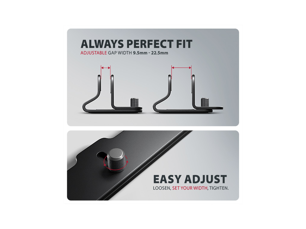 rozpětí stojanu od 9.5 mm do 25.5 mm, díky kterému do něj snadno vložíte většinu notebooků. Nastavenou šířku spolehlivě udrží broušený
