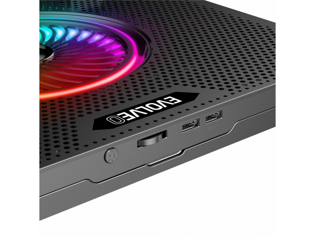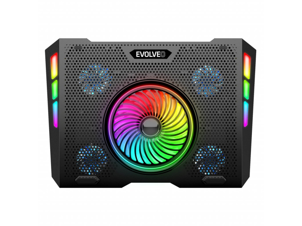 Chladicí podložku EVOLVEO Ania 16 s RGB podsvícením využijete pro notebooky o velikosti 10-17''. Bezesporu oceníte možnosti nastavení polohy a regulaci otáček ventilátoru. Pomocí tlačítek u displeje lze přepínat mezi deseti barevnými módy (červená, zelená, modrá, světlemodrá, fialová, RGB, ...), které osvětlují okraj a střed podložky. Podržením tlačítka pro ovládání barevných módů po dobu delší 3s dojde k zapnutí/vypnutí LED osvětlení. Tlačítkem pro regulaci otáček lze ovládat plynule rychlost ventilátorů a tyto pak i zcela vypnout.5 ventilátorů pro kvalitní chlazení