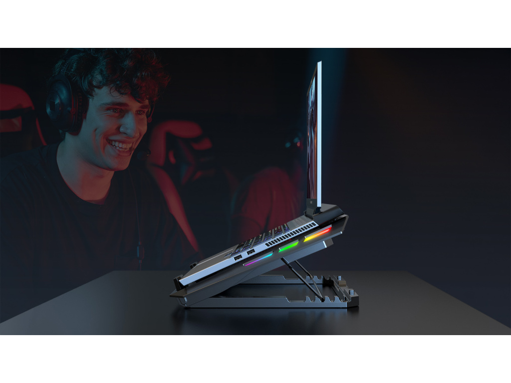 • chladící podstavec pro notebooky 10-17'' • 1x125mm ventilátor a 4x70mm ventilátor • 10 RGB barevných módů (červená, zelená, modrá, světlemodrá, fialová, RGB, ...)
