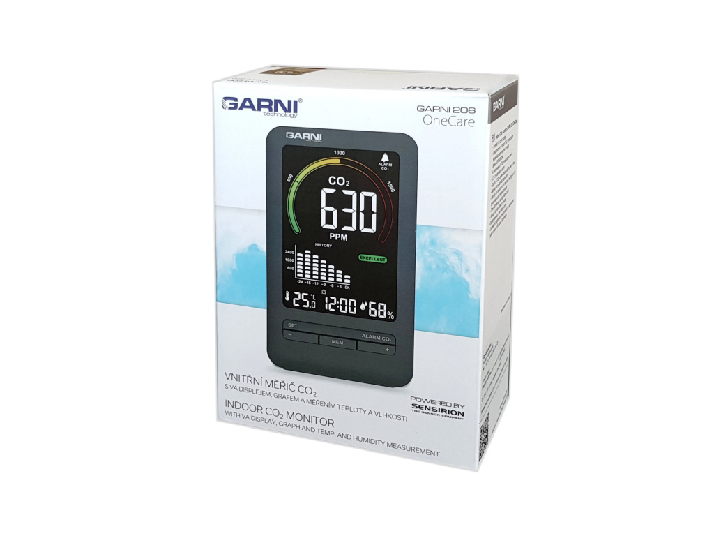 Měřič CO2 (kysličníku uhličitého) GARNI 206 OneCare je určen pro vnitřní použití. Měří a zobrazuje na svém barevném inverzním VA displeji hodnoty CO2 ve vzduchu a také teplotu a relativní vlhkost. Graf zobrazuje vývoj naměřené hodnoty CO2 za uplynulých 24 hodin. Pro měření CO2, teploty a relativní vlhkosti je použito fotoakustické čidlo SENSIRION řady SCD4x