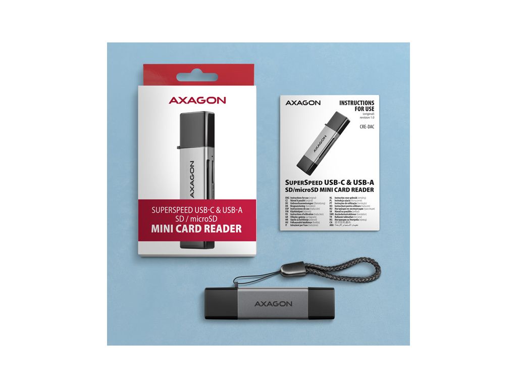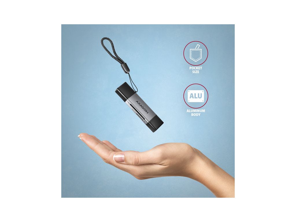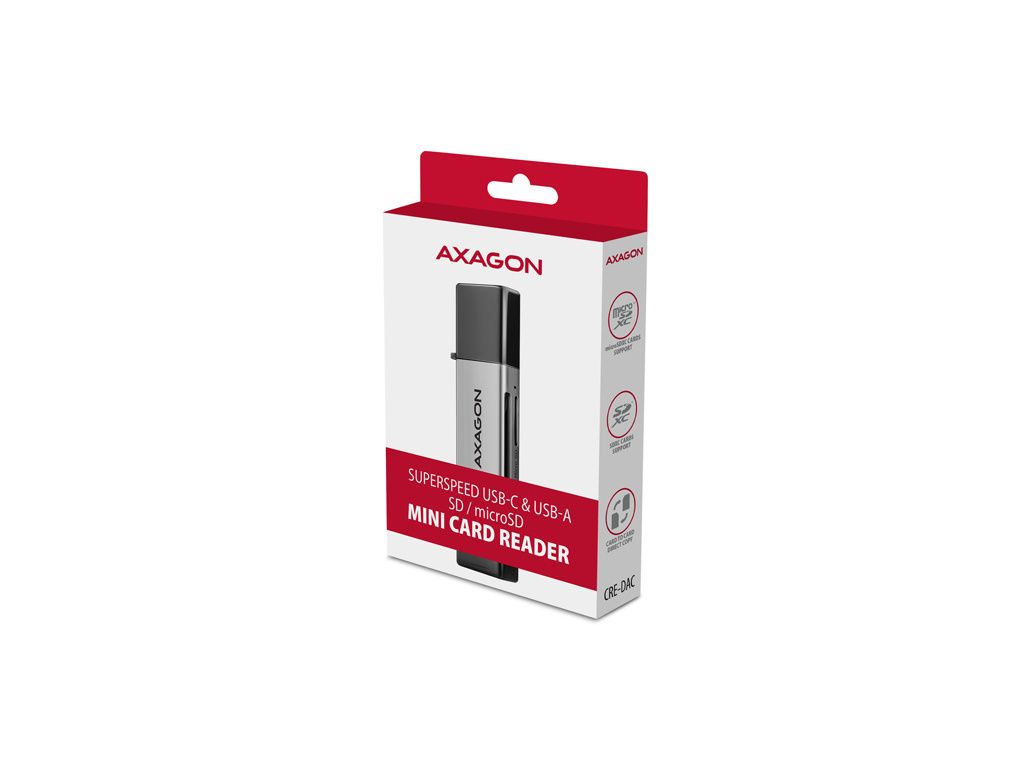 Mobilní Mini čtečka paměťových karet AXAGON CRE-DAC s rozhraním USB 5 Gbps podporuje všechny současné verze SD a microSD karet včetně SDXC a microSDXC s kapacitou až 2TB.