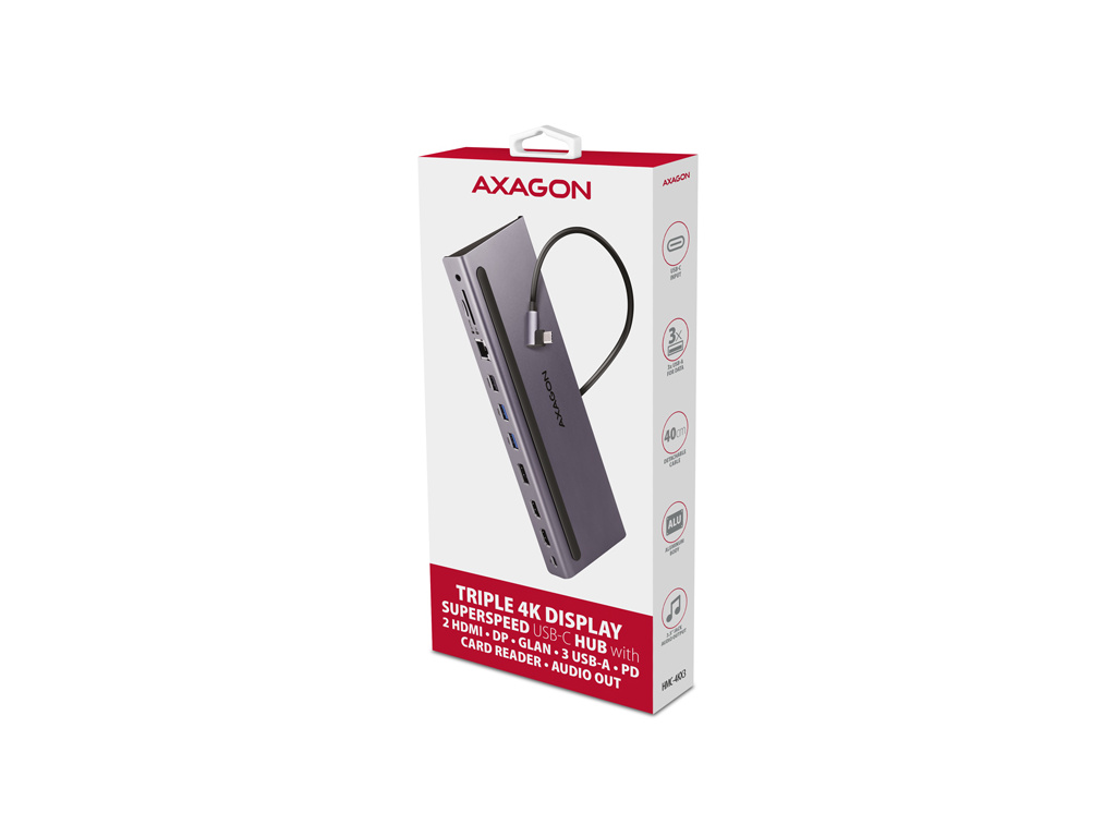 AXAGON HMC-4KX3 USB 5Gbps hub, 3x USB-A, 2x HDMI, DP, RJ-45, SD/microSD, audio, PD 100W, kabel 40cm, HMC-4KX3