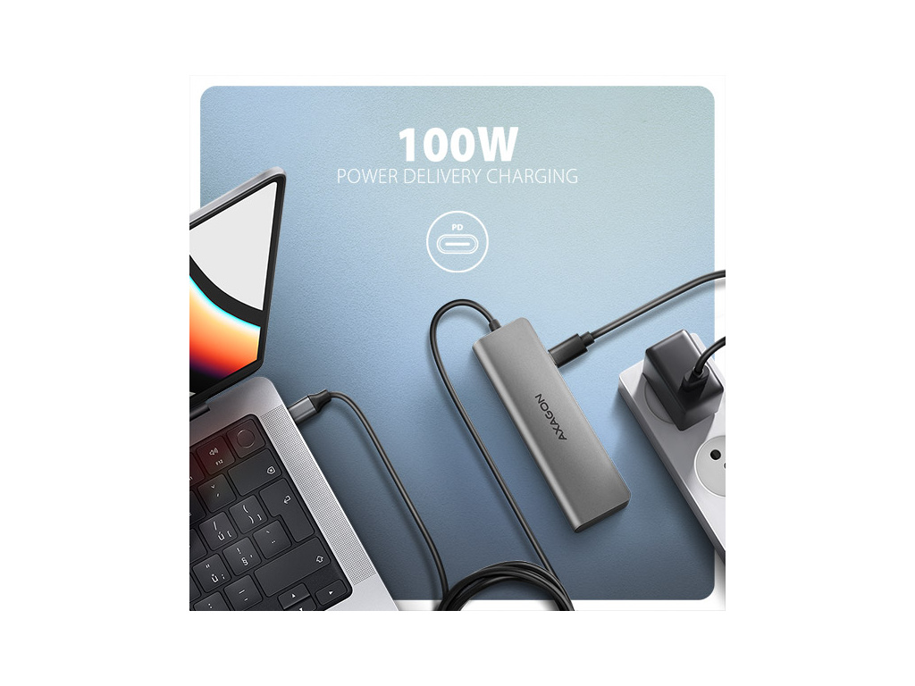 Power Delivery 3.0 výkonem až 100W. Do hubu zapojíte vhodnou USB-C Power Delivery nabíječku a hub připojíte k notebooku s podporou Power Delivery. Tím také uvolníte jeden USB-C port vašeho notebooku.