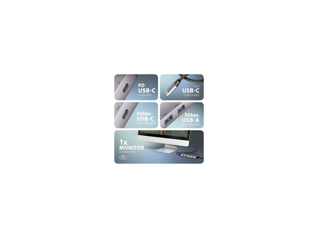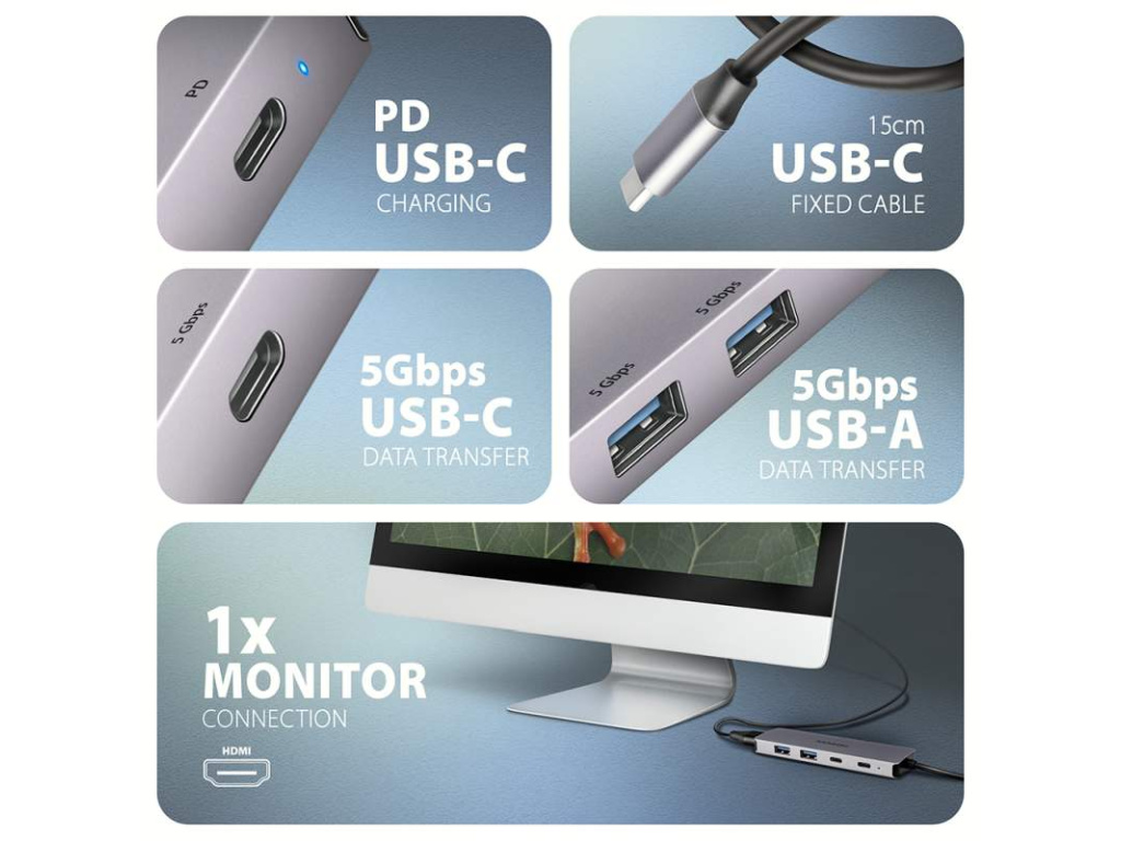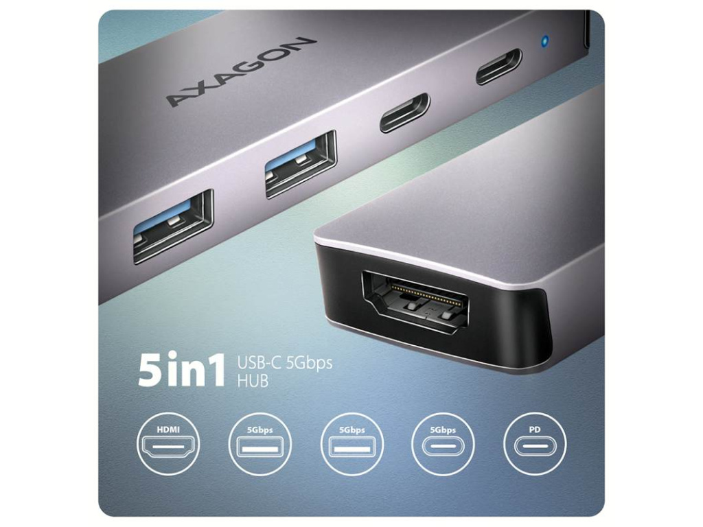 AXAGON HMC-5H60, USB 5Gbps hub, porty 2x USB-A, 1x USB-C, HDMI 4k/60, PD 100W, kabel USB-C 15cm, HMC-5H60