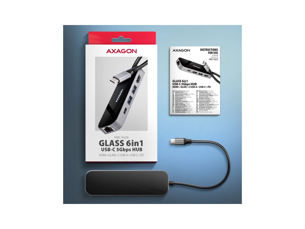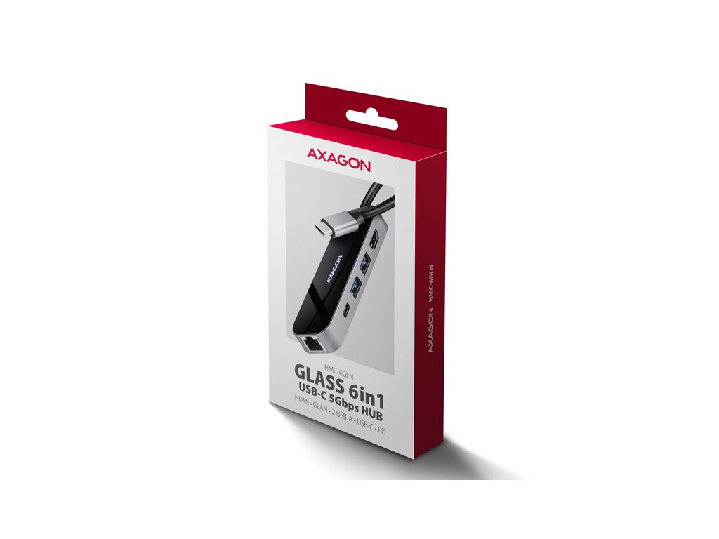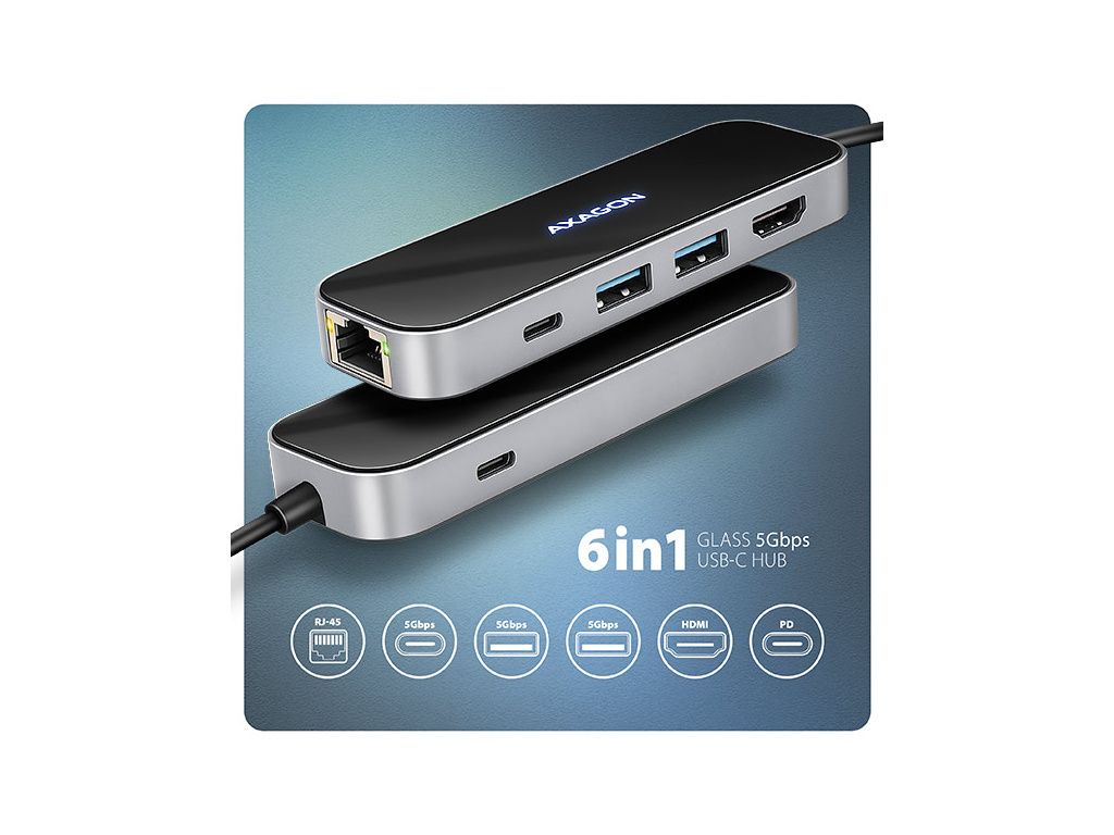 Multiportový USB-C 5GbpsAXAGON HMC-6GLN GLASS 6in1 hub rozšíří váš notebook, počítač nebo telefon o