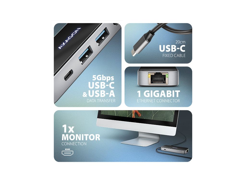 AXAGON HMC-6GLN, USB 5Gbps hub, 2x USB-A, USB-C, HDMI 4k/60Hz, RJ-45 GLAN, PD 100W, kabel USB-C 20cm, HMC-6GLN