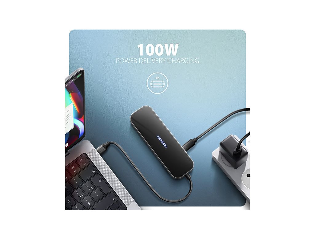 Power Delivery 3.0 výkonem až 100W. Do hubu zapojíte vhodnou USB-C Power Delivery nabíječku a hub připojíte k notebooku s podporou Power Delivery. Tím také uvolníte jeden USB-C port.