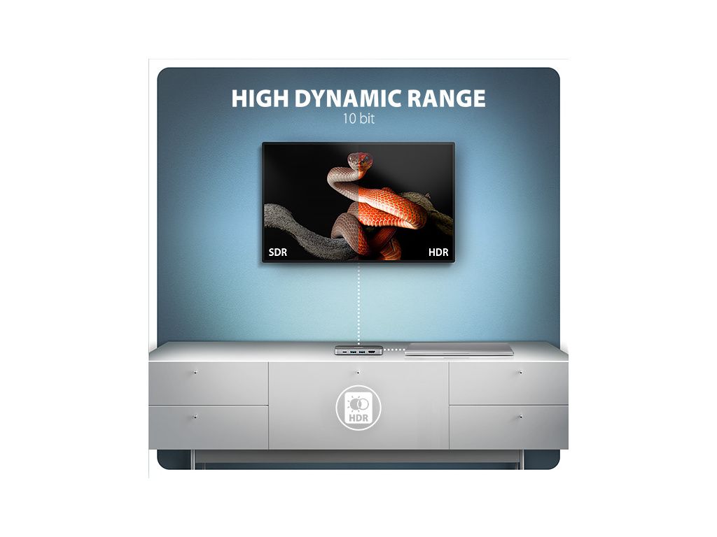 Vlastnosti videa: • U zařízení Apple s macOS je maximální obnovovací frekvence většinou omezena na 60Hz. • Pro dosažení maximálních hodnot rozlišení a frekvencí na video výstupech je nutné hub zapojit do USB-C portu s podporou DisplayPort Alternate Mode (DP Alt Mode) verze min. 1.4 nebo do USB-C portu s podporou min. Thunderbolt 3. Dále je nutný vhodný aktualizovaný OS a aktuální grafické ovladače. • Podpora HDR (High Dynamic Range, 10 bit support) - realistická reprodukce světlých a tmavých detailů. • Podpora HPD (Hot-Plug-Detect). • Podpora TMDS (Transition Minimized Differential Signaling). • Plná podpora HDCP 1.4 a 2.2 (High-bandwidth Digital Content Protection). • Podpora 2kanálového LPCM zvuku, komprimovaného audia (AC-3, DTS) a HBR audio formátů. • Podpora vzorkovací frekvence až 192 kHz a až 24bitového zvuku – závisí na zdrojovém a koncovém zařízení, tj. notebooku/telefonu a TV/monitoru/AV receiveru.