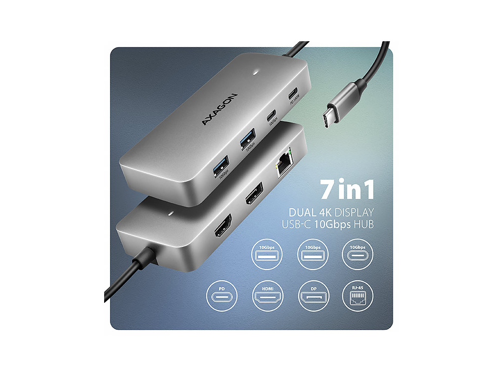 Multiportový USB-C 10GbpsAXAGON HMC-CUB83X2 DUAL 4K DISPLAY 7in1 hub rozšíří váš notebook, počítač nebo telefon o