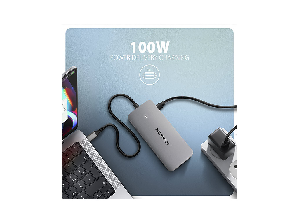 výkonem až 100 W. Do hubu zapojíte vhodnou USB-C Power Delivery nabíječku a hub připojíte k notebooku s podporou Power Delivery. Tím také uvolníte jeden USB-C port. Dokovací stanice