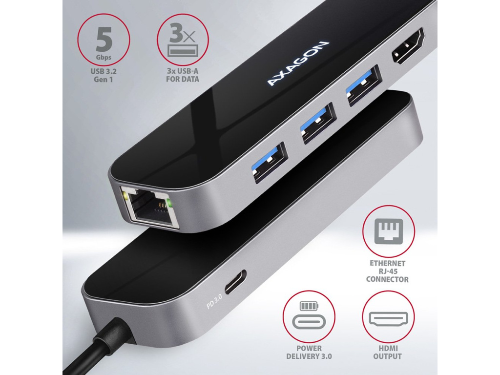 AXAGON hub USB-C / HMC-6GL / USB 3.2 Gen1 / 3x USB-A / HDMI / GLAN / 60W PD / 0,2m, HMC-6GL
