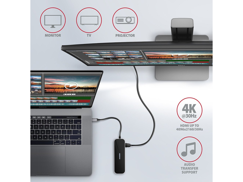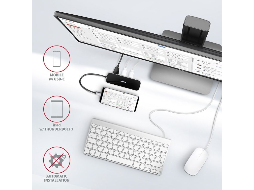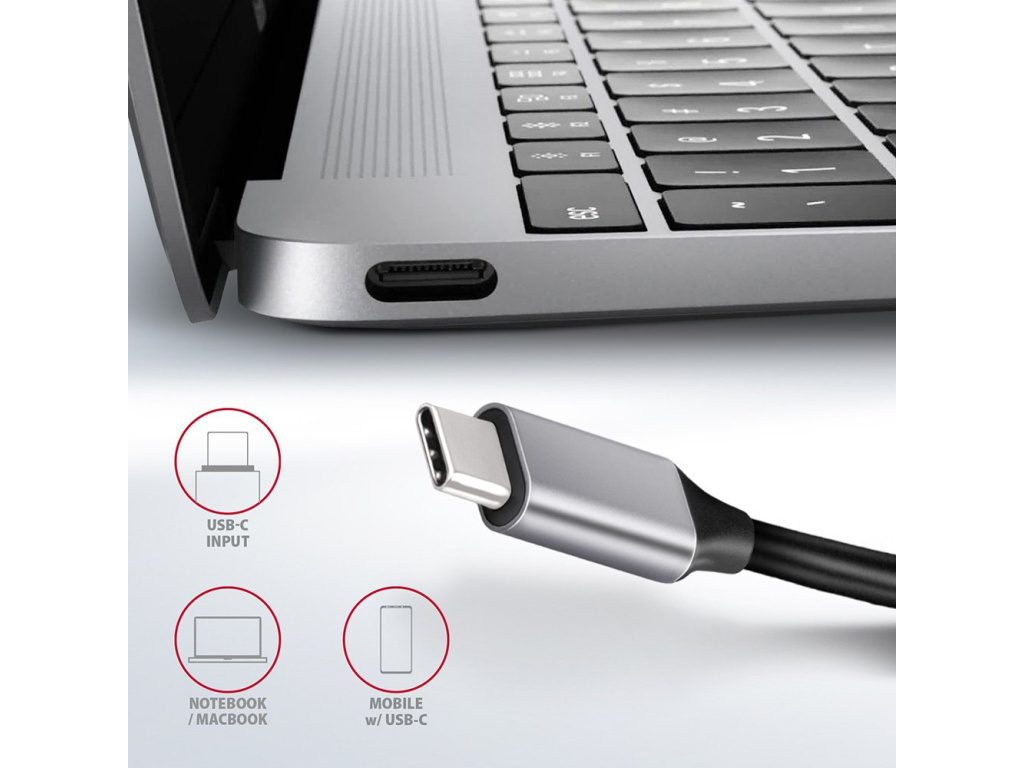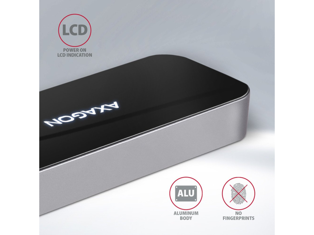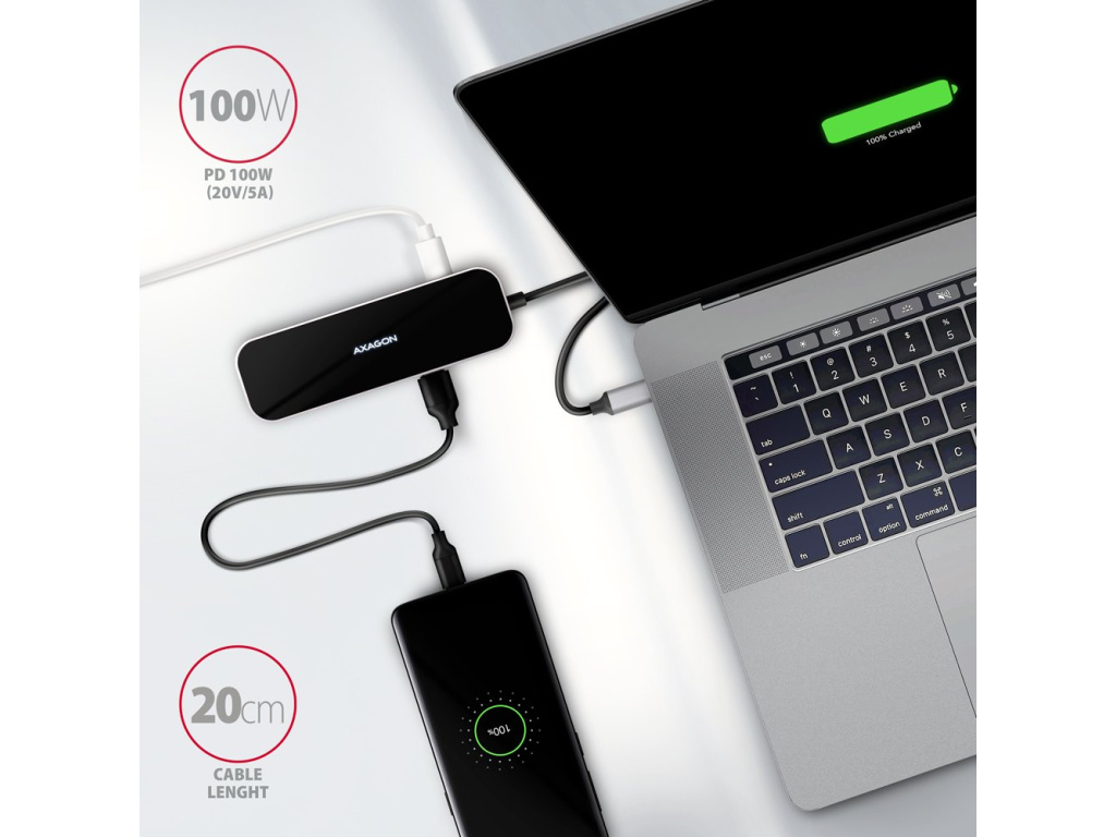AXAGON HMC-6GLDokovací stanice v hliníkovém provedení nabízí velké množství praktických portů. K počítači či notebooku se připojuje pomocí konektoru USB-C, který slouží k přenosu dat rychlostí až 5 Gb/s. K dokovací stanici lze skrze rozhraní HDMI připojit monitor s rozlišením až 4K při 30 Hz. Pro připojení periférií jsou přítomny tři USB 3.0 porty. Stanice taktéž nabízí USB-C Power Delivery až 60 W, který je určen pro napájení připojeného notebooku či tabletu pomocí vašeho originálního síťového adaptéru. Vysokorychlostní přístup k síti a internetu lze realizovat skrze přítomný gigabitový RJ-45 port.