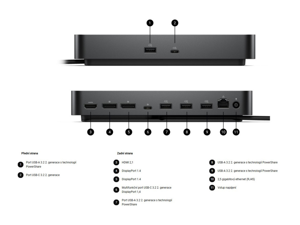 Porty USB (napájení) 4 x USB-A 3.2 Gen 2 (4,5 W každý) 1 x USB-C 3.2 Gen 2 (15 W) 1 × multifunkční rozhraní USB-C DisplayPort (7,5 W) Všechny dodávají energii s počítačem nebo bez něj