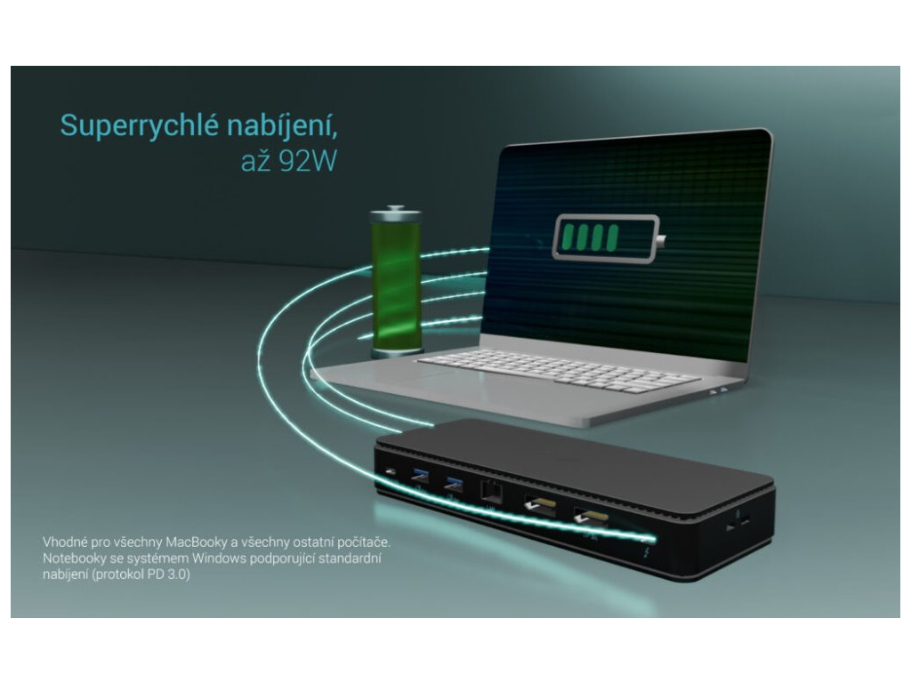 - Poskytuje až 92 W Power Delivery pro kompatibilní notebooky a tablety s rozhraním USB4, USB-C a Thunderbolt. Hostitelské zařízení musí podporovat USB-C Power Delivery.