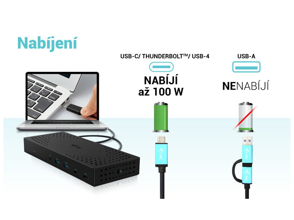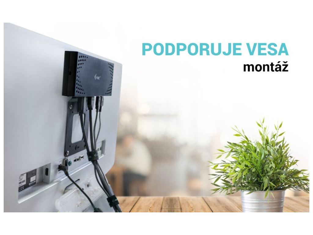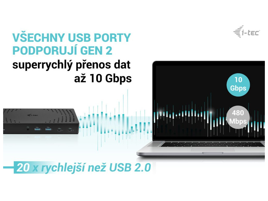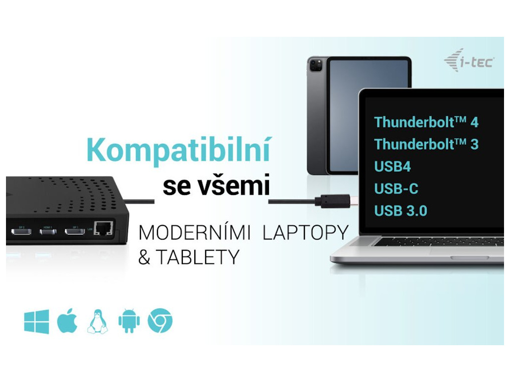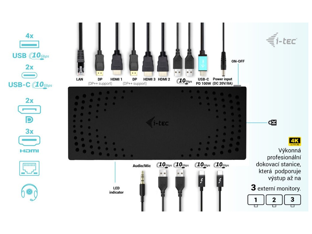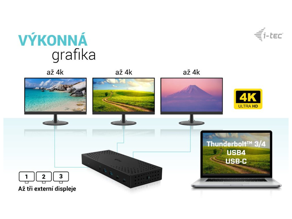 I-TEC Thunderbolt/ USB 3.0 4KDokovací stanice je vybavena pěti grafickými výstupy, díky kterým podporuje připojení až tří displejů s rozlišením 4K při 60 Hz. K počítači či notebooku se připojuje pomocí USB 3.0 či USB-C portu s podporou Thunderbolt 3 a je tak schopná na podporovaných zařízeních přenášet i napájení až 100 W. Dokovací stanice dále nabízí kombinovaný audio konektor, RJ-45 port, čtyři USB 3.1 porty, dva porty USB-C a zámek Kensington. V neposlední řadě zajisté potěší také možnost VESA uchycení.