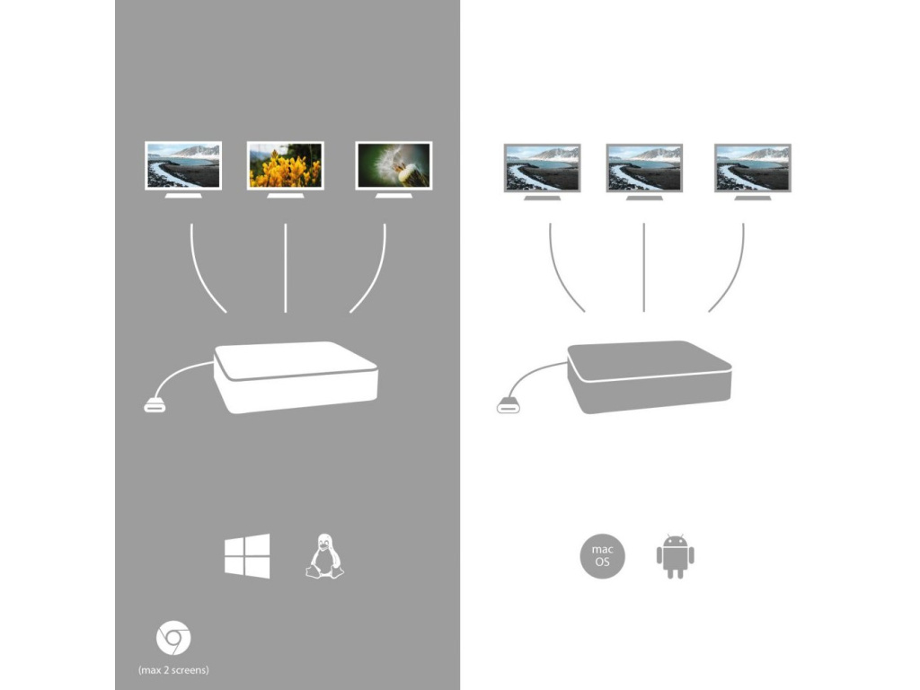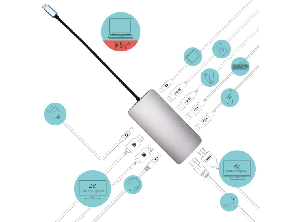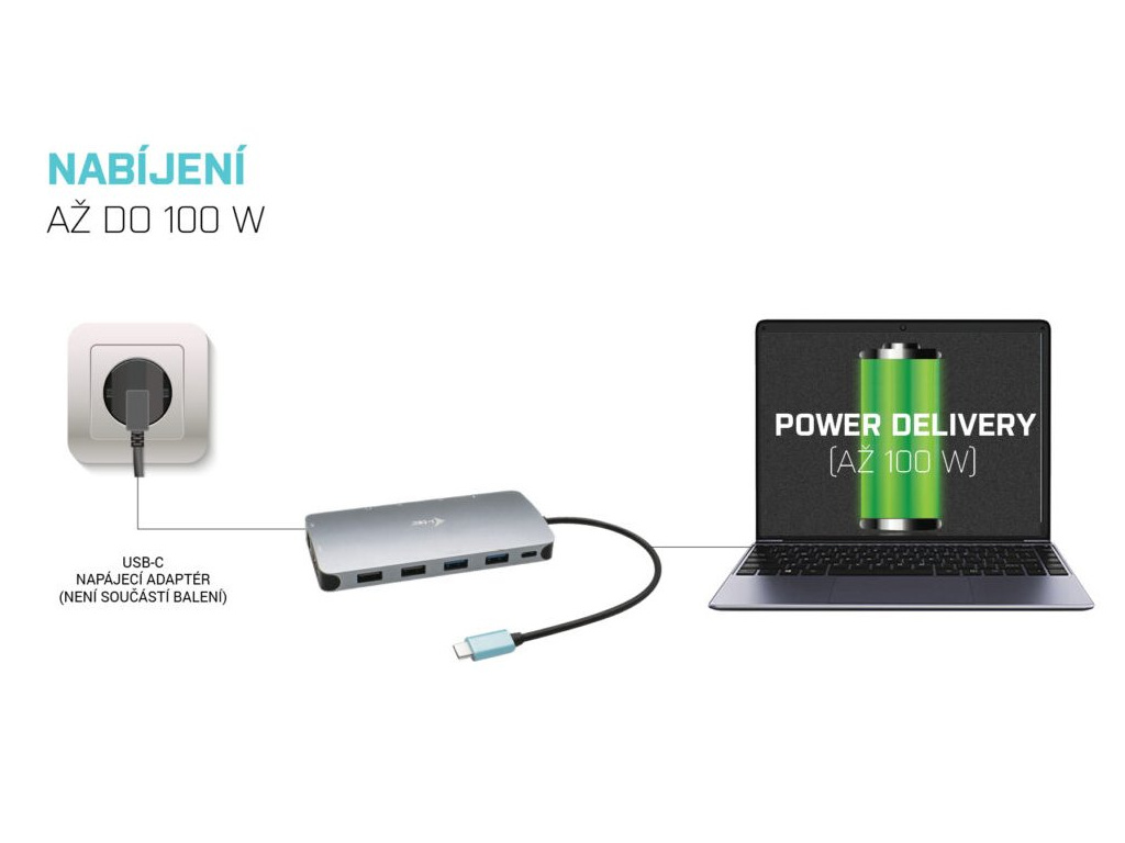 I-TEC USB-C Metal Nano Dock 100 WDokovací stanice vhodná pro uživatele pracující s 4K rozlišením. K počítači či notebooku se připojuje pomocí USB-C portu s podporou Thunderbolt 3 a je tak schopná na podporovaných zařízeních přenášet i napájení až 100 W. Kromě možnosti připojit dva 4K monitory nabízí i volbu zapojit až tři Full HD monitory. Vysokorychlostní přístup k internetu lze realizovat skrze přítomný RJ-45 port. Pro připojení periférií jsou přítomny dva USB 3.0 porty, dva USB 2.0 porty a jeden USB-C port pro data. Pro připojení sluchátek či mikrofonu pak slouží kombinovaný 3,5 mm konektor.