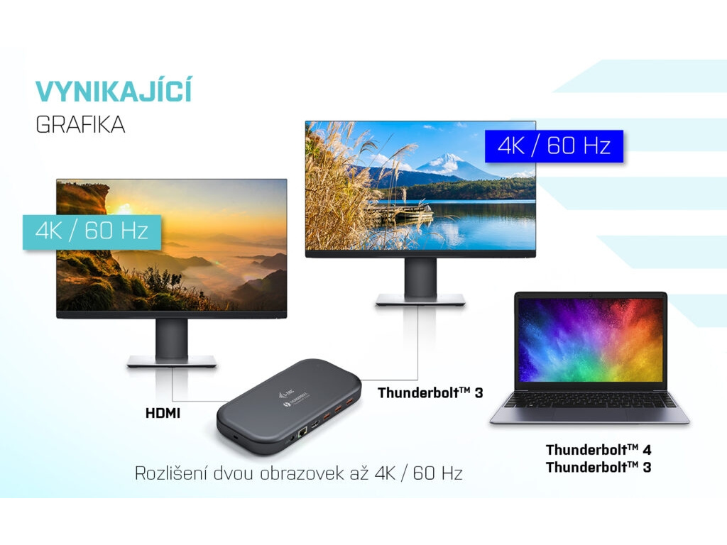 s obnovovací frekvencí 30 Hz, které se rovná rozlišení čtyřech monitorů, každý v rozlišení 4K. Jedná se tedy o ideální řešení pro grafické designéry, analytiky, vývojáře, filmové editory či nadšence a milovníky videí ve vysokém rozlišení. Druhá generace Thunderbolt 3 technologie znamená, že dokovací stanice je nově kompatibilní nejen s porty Thunderbolt™ 3, ale zároveň i USB-C a USB4, což z ní dělá flexibilní řešení pro firmy a uživatele, kteří provozují notebooky a tablety s různými porty (v případě připojení s USB-C a USB4 však bude fungovat pouze jeden monitor a port Thunderbolt 3 na dokovací stanici bude přenášet data rychlostí USB 2.0). • Připojte dva 4K/60Hz externí monitory, nebo jeden v rozlišení 8K/30Hz