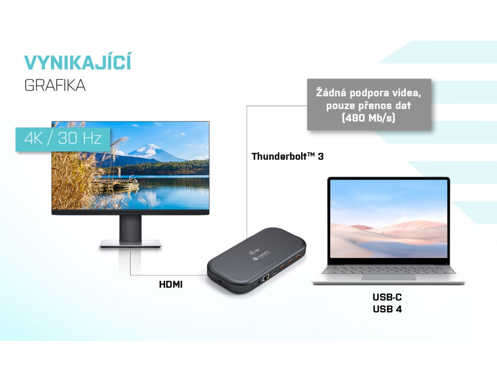 Při připojení k notebooku s USB-C/USB4 portem klesne rychlost přenosu dat na Thunderbolt™ 3 portu na rychlost USB 2.0 a video přes tento port nebude aktivní) (