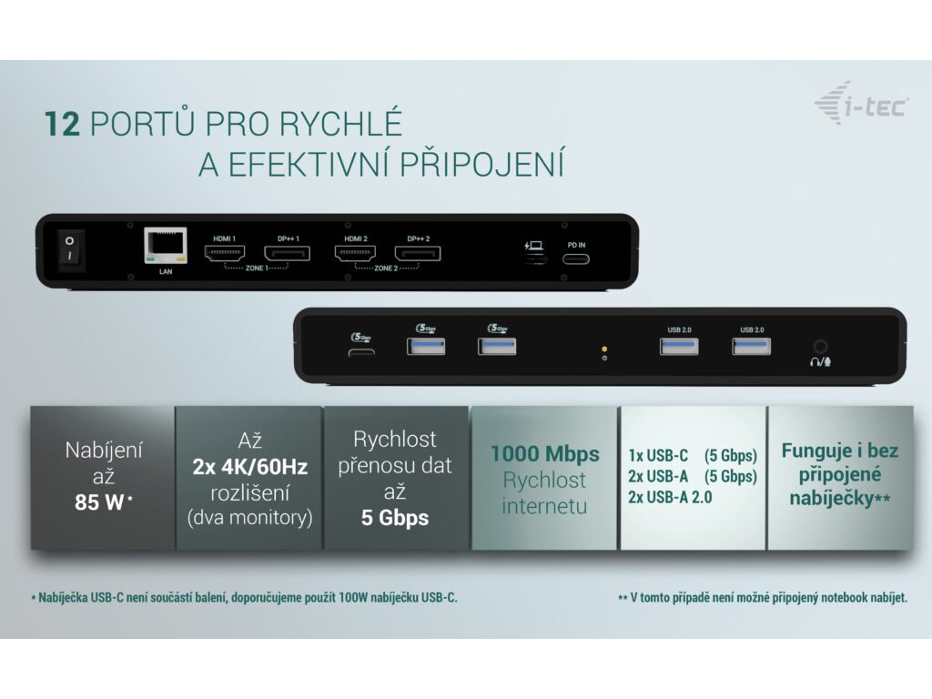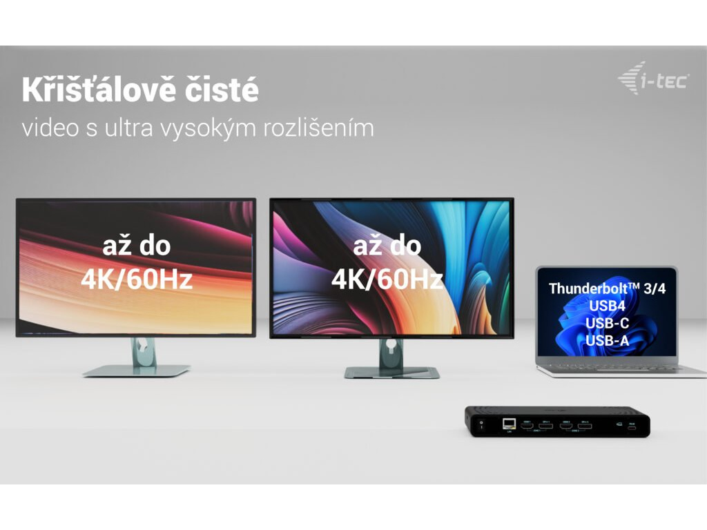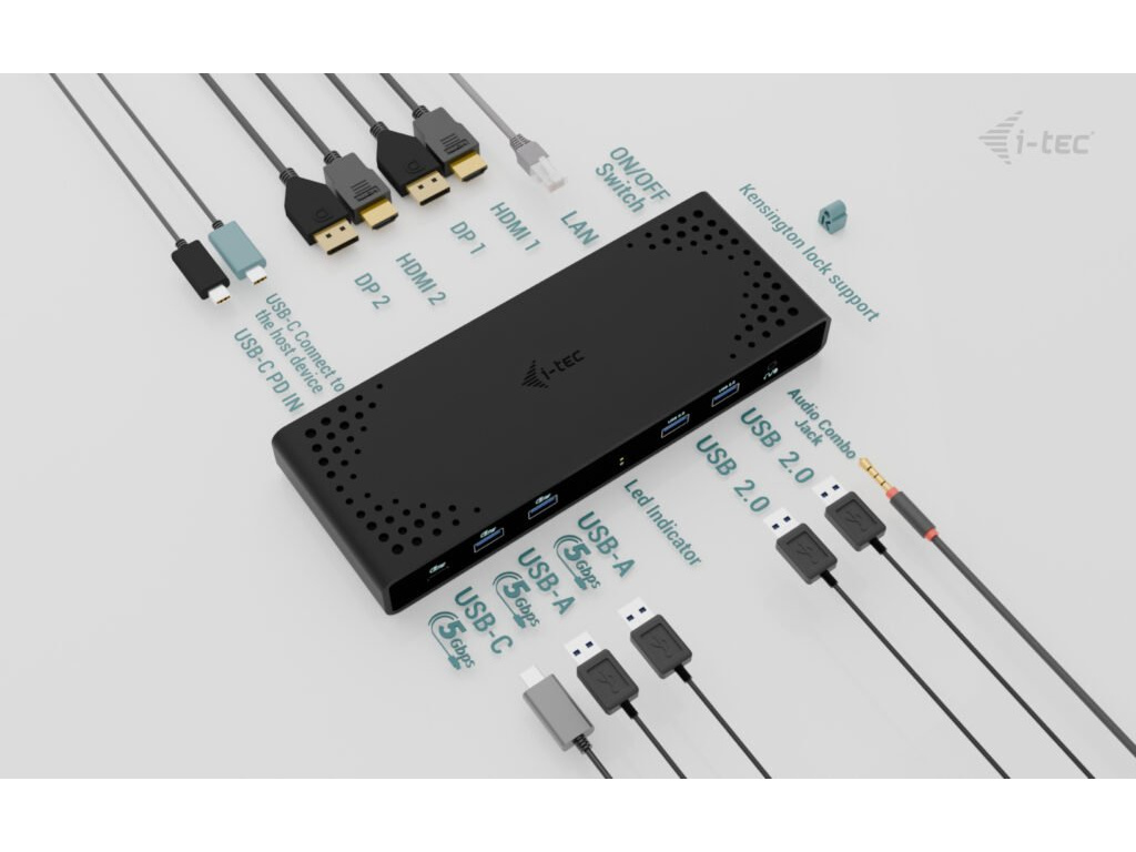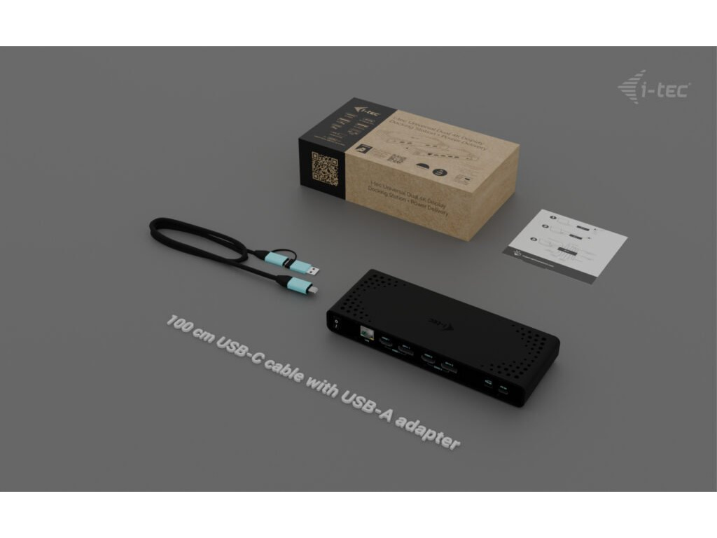 • Univerzální dokovací stanice kompatibilní s notebooky a tablety s rozhraním USB-C, USB-A, USB4 a Thunderbolt. • 2x DisplayPort a 2x HDMI podporující až dva displeje 4K/60Hz (platí i pro platformu Apple M1/M2/M3) nebo jeden displej 5K/60Hz. • 5x port USB včetně 1x USB-C 3.1 (5 Gbps, s podporou rychlého nabíjení BC 1.2) a 2x USB-A 3.1 (5 Gbps, s podporou rychlého nabíjení BC 1.2), což usnadňuje připojení více USB zařízení a periferií pro rychlý přenos dat. • Dokovací stanici je možné provozovat i bez USB-C nabíječky, a to i v případě připojení k notebooku přes USB-A konektor • Poskytuje až 85W Power Delivery pro kompatibilní notebooky a tablety s rozhraním USB-C, USB4 a Thunderbolt. • GLAN Ethernet podporuje síťové rychlosti 10/100/1000 Mbps, čímž poskytuje robustní a vysokorychlostní připojení k internetu. • Samostatné 3,5mm audio vstupní a výstupní konektory pro snadné připojení náhlavní soupravy nebo reproduktorů. • Možnost instalace držáku VESA, který vám pomůže udržet pořádek na stole a zbavit se kabelů, a slot K-lock pro větší bezpečnost. Poznámka: USB-C nabíječka není součástí dodávky. Dokovací stanici lze používat bez nabíječky, nebo s nabíječkou dodanou např. s vaším notebookem, případně lze nabíječku zakoupit samostatně, například i-tec CHARGER-C100W. Alternativně můžete zakoupit produktovou sadu CADUA4KDOCKPDB100, který již obsahuje napájecí zdroj. Výkonná, přitom cenově dostupná dokovací stanice, která podporuje výstup až na dva externí monitory ve vysokém rozlišení, a to až 4K/60 Hz. Dokovací stanici lze použít prakticky se všemi notebooky, protože podporuje připojení ke všem běžným portům: 3.0, USB-C, USB4 a Thunderbolt“ 3/4 a zároveň podporuje všechny běžné současné operační systémy. Dostatek portů, spolehlivé a rychlé připojení k firemní síti díky integrovanému portu LAN a podpora instalace za monitor, to vše dělá z této dokovací stanice ideálního společníka pro opravdové profesionály. Dokovací stanici lze používat při pouhém připojení k notebooku (bez připojení USB-C nabíječky), případně za použití USB-C nabíječky (není součástí balení). V takovém případě podporuje nabíjení notebooku nebo tabletu, a to až do výkonu 85 W. • Připojení 2 externích monitorů v rozlišení až 4K/60Hz • Power Delivery: až 85W (v případě použití USB-C nabíječky o výkonu 100W, není součástí balení) • K dispozici 2 porty DisplayPort a 2 porty HDMI • 2x USB 3.1 Gen 1 (5 Gb/s), 2x USB 2.0 a 1x USB-C Gen 1 (5 Gb/s) umožňují snadné připojení vašich USB zařízení a periferií • Gigabitový Ethernet RJ-45 poskytuje spolehlivé, robustní a vysokorychlostní připojení k internetu s podporou rychlostí 10/100/1000 Mb/s • Kombinovaný konektor pro zvuk a mikrofon • Zámek Kensington poskytuje ochranu proti krádeži, zejména ve sdíleném kancelářském prostředí nebo na veřejných místech • Vypínač napájení dokovací stanice umožňuje maximální úsporu energie • Dokovací stanice podporuje držák VESA pro inteligentní vertikální instalaci za monitor s podporou VESA • Podporuje systémy Windows 10 / 11, macOS, Android 5 nebo novější, Chrome OS R51 nebo novější, Linux Ubuntu Pokud je dokovací stanice připojena přes port USB 3.0, nabíjení není podporováno.Specifikace • 1x USB-C port pro připojení k zařízení s USB-C nebo USB-A rozhraním (propojovací kabel USB-C a adaptér USB-C na USB-A jsou součástí balení) • Technologie dokovací stanice: DisplayLink + USB-C PD • Power Delivery: 85W