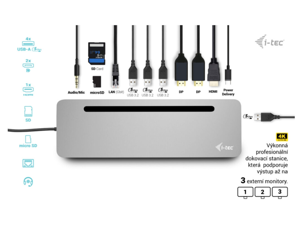 • 1x port USB-C PD (pouze napájení) • 4x port USB-A 3.2 Gen. 1 (5 Gb/s) • 1x port Ethernet GLAN RJ-45 • 1x slot SD / microSD • 1x 3,5 mm kombinovaný audio port • Klonování adres MAC: Ano (pomocí softwaru i-tec Docker Pro)