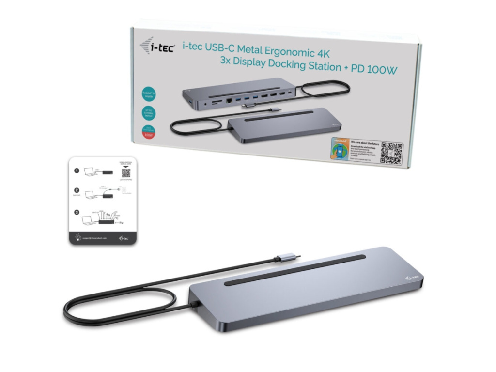 i-tec USB-C Metal Ergonomic 3x 4K Display Docking Station, Power Delivery 100 W, C31FLAT2PDPRO