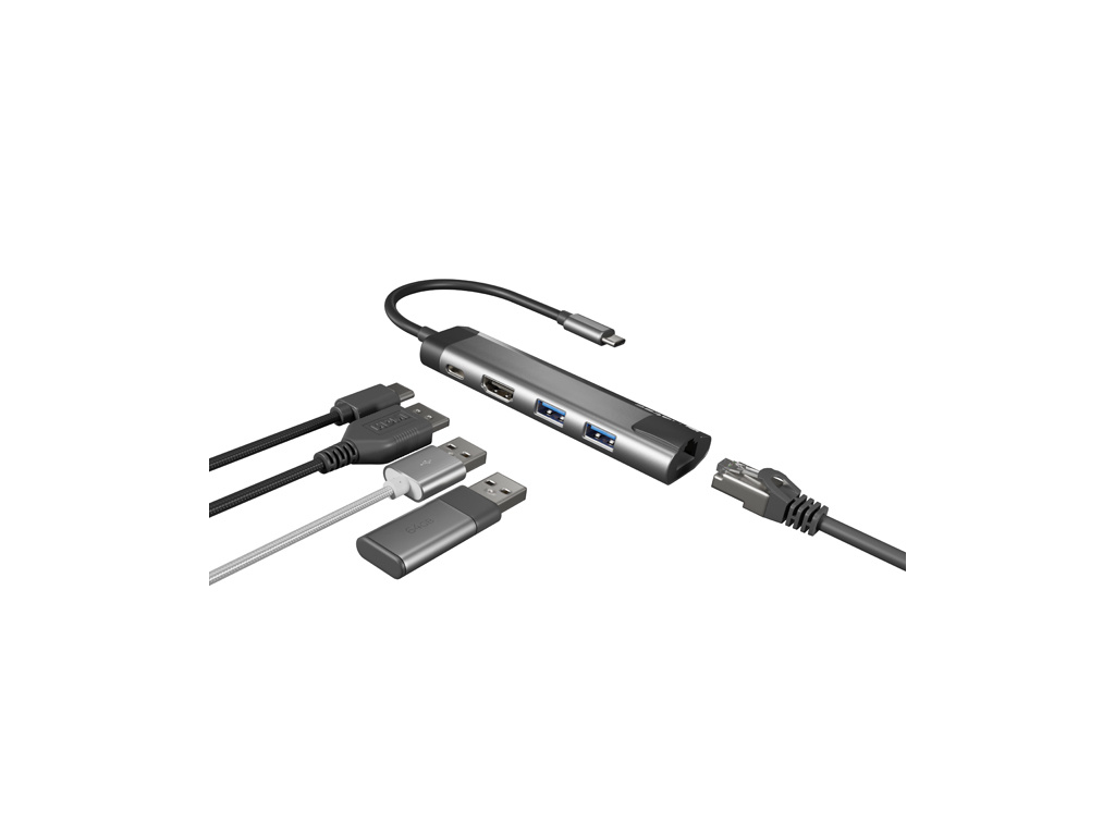 Natec multiport adaptér FOWLER GO HUB 5v1, 2X USB 3.0 HUB, HDMI 4K, USB-C PD, RJ45, NMP-1985